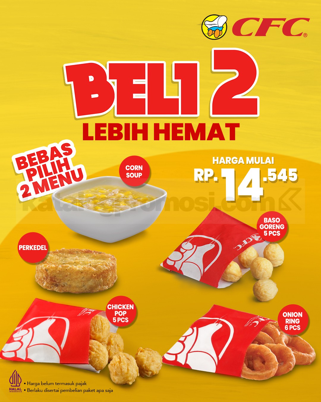 Melalui Promo CFC Beli 2 Menu Favorit Mulai Rp. 14.000, kamu bebas memilih dua item dari Corn Soup yang hangat, Baso Goreng yang gurih, Perkedel, Chicken Pop yang renyah, atau Onion Ring yang crispy. Lebih banyak pilihan bikin momen makan jadi makin puas tanpa harus nambah biaya besar 🍗🍟