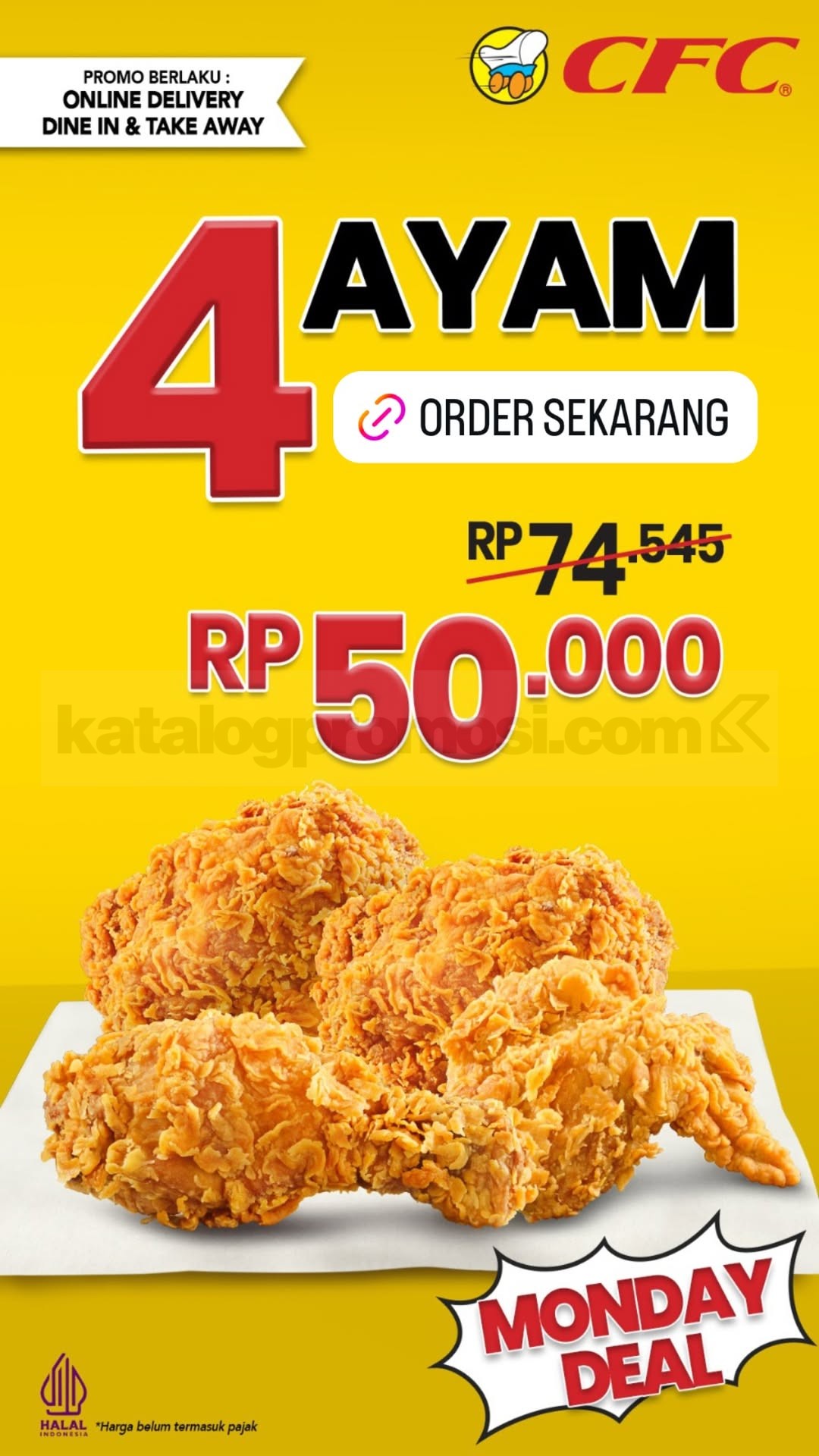 Promo CFC Monday Deal 4 Ayam Rp. 50.000 paket ayam favorit CFC untuk dine in, take away, dan delivery, berlaku setiap hari Senin di lokasi tertentu.