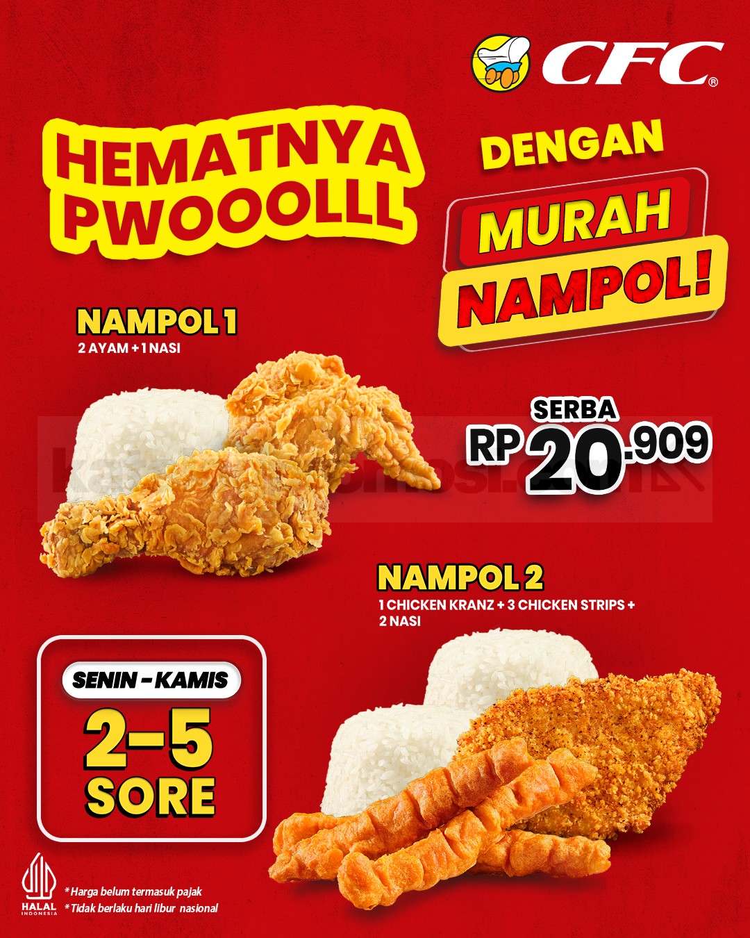 Beneran hematnya pwwol di CFC dengan Promo Murah Nampol semua paket Rp.20.909! 😋 Mulai Senin sampai Kamis, jam 2–5 sore, nikmati paket favorit CFC dengan harga super terjangkau.