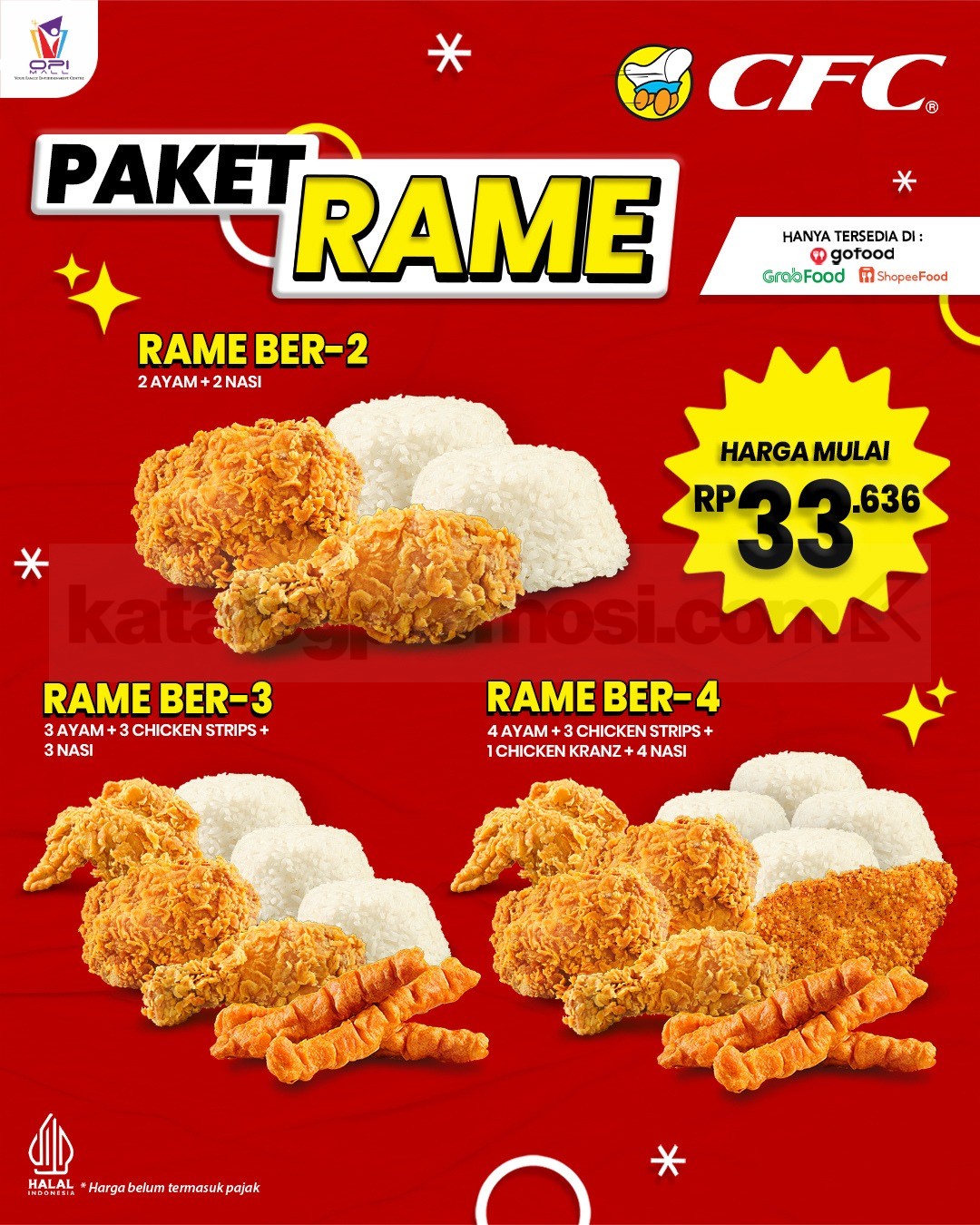 Promo CFC Paket RAME Harga mulai dari Rp33.636. Berlaku via GoFood, GrabFood, ShopeeFood s.d 31 Juli 2025!