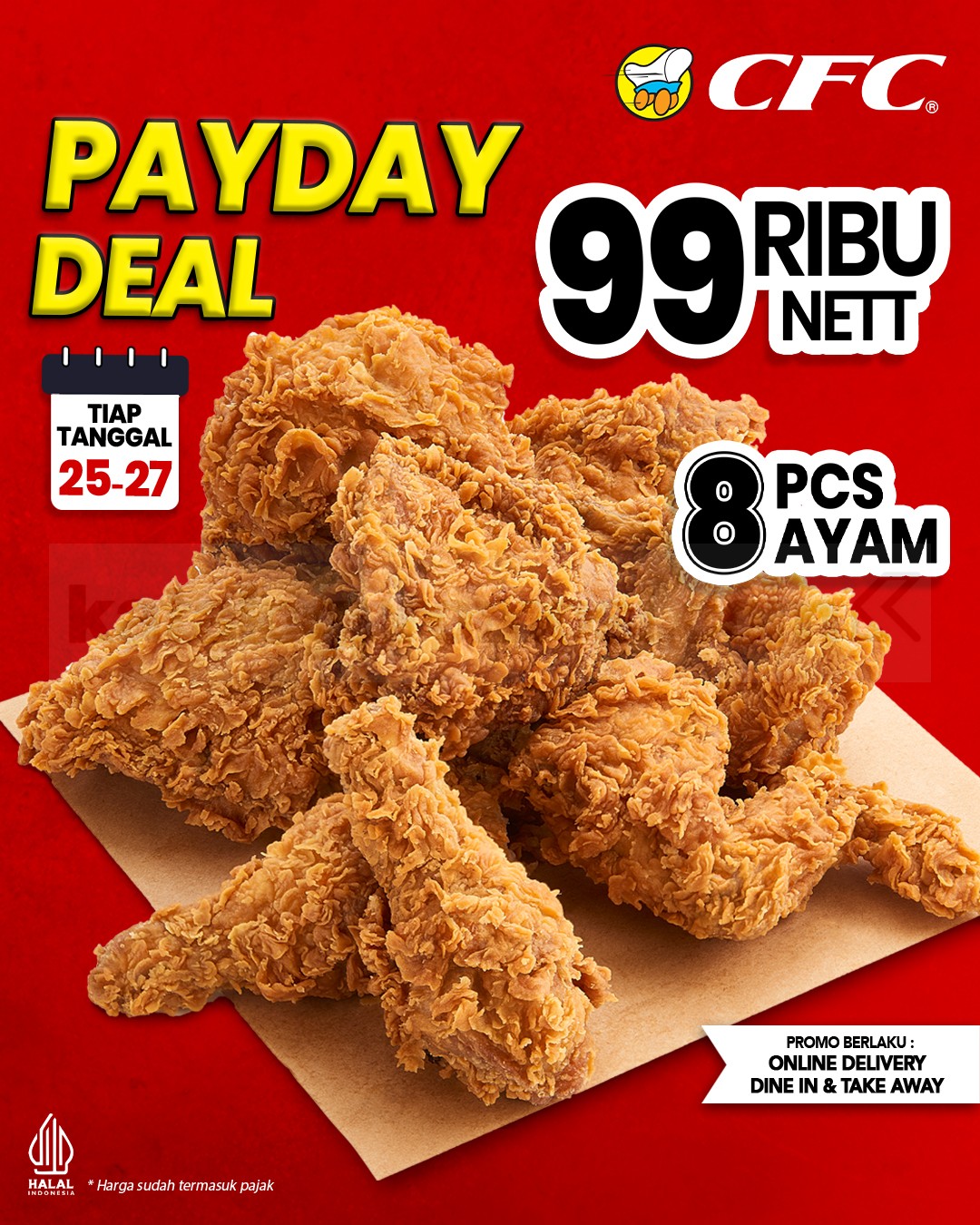 Promo CFC Payday Deal 8 pcs Ayam Rp. 99.000 NETT berlaku mulai tanggal 25 – 27 Januari 2026 untuk dine in, take away, dan online delivery di outlet tertentu.