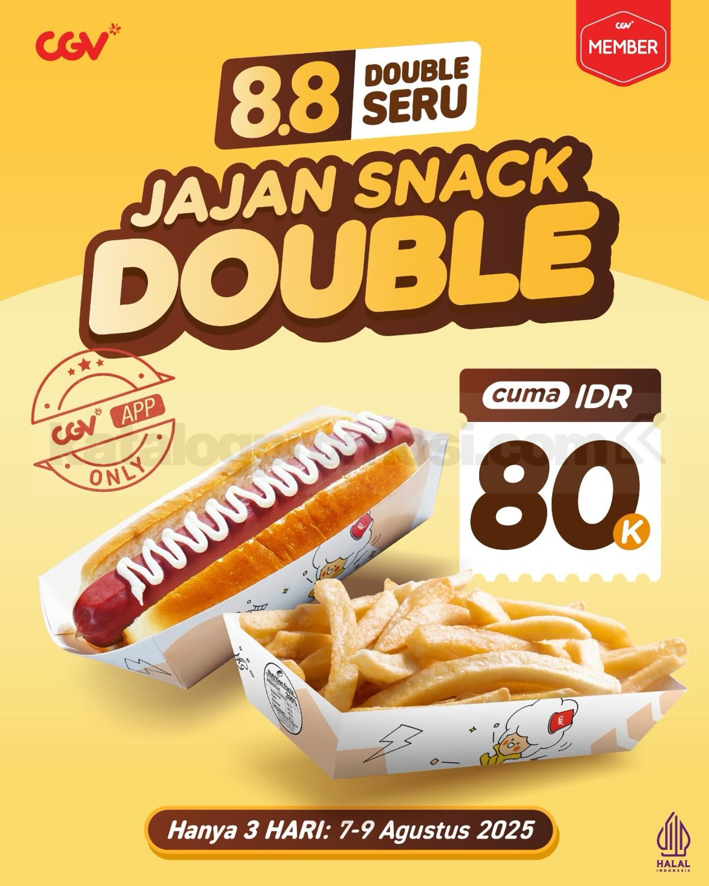 Promo CGV 8.8 Double Seru jajan 2 snack Rp80.000 berlaku mulai tanggal 7β9 Agustus 2025 khusus pembelian dan penukaran via CGV App