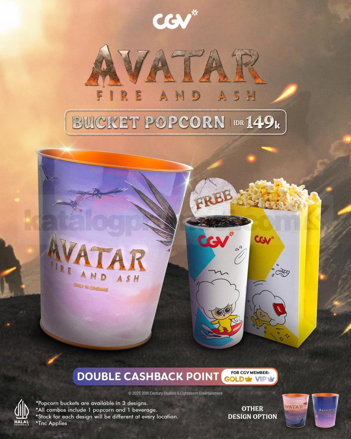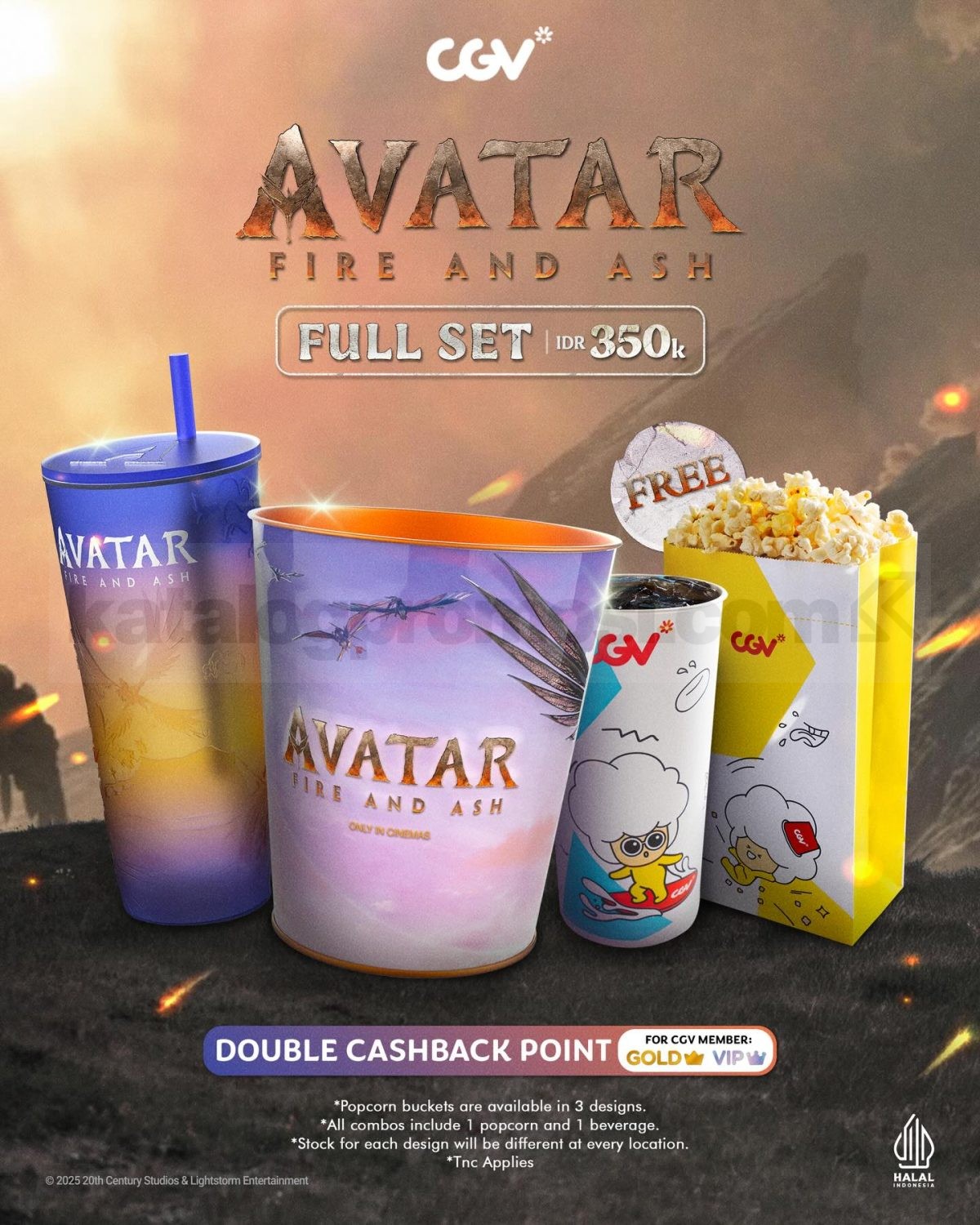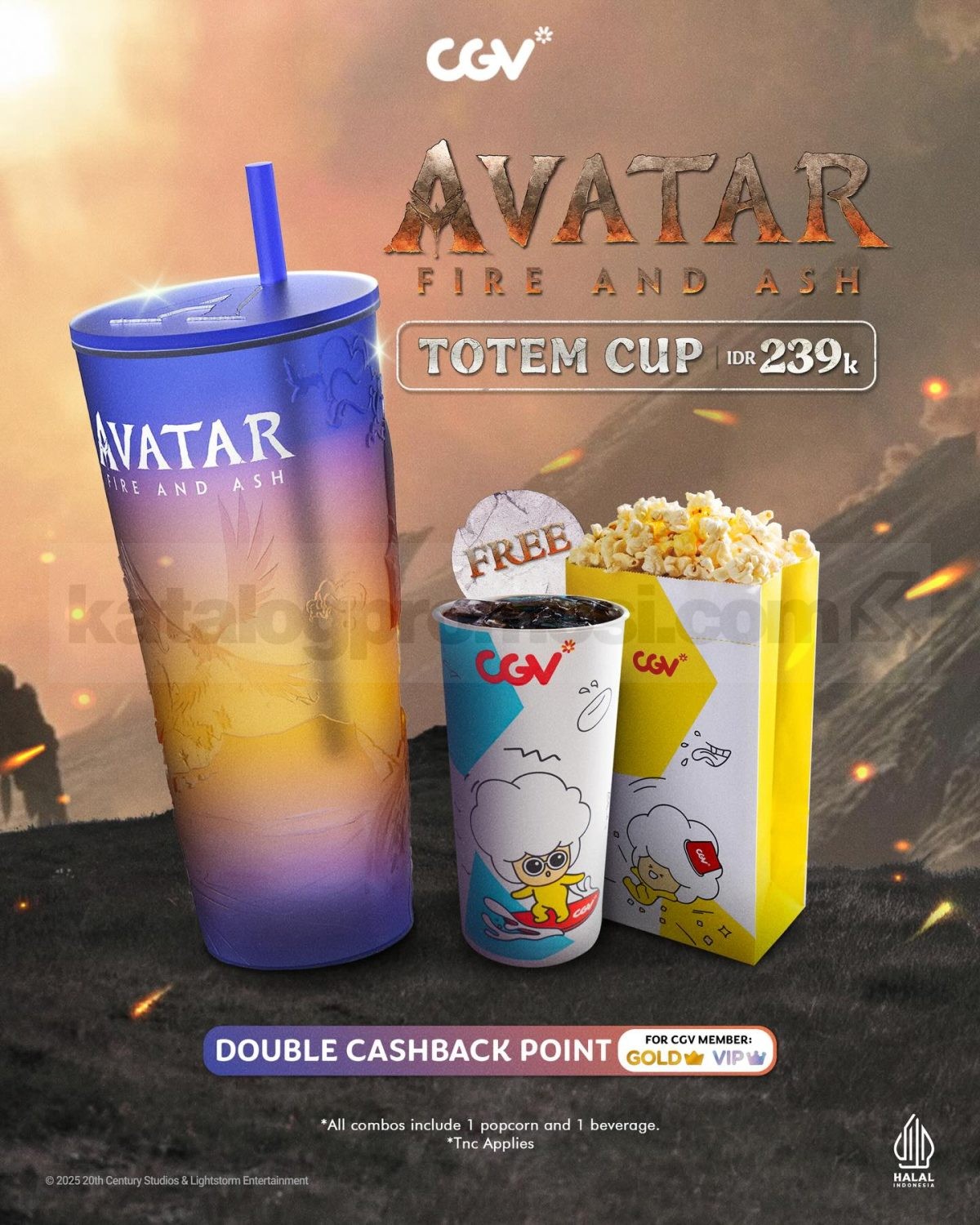 Promo CGV Avatar Fire And Ash Merchandise Combo eksklusif dengan pilihan paket popcorn bucket dan totem cup berlaku pembelian offline di kasir CGV dengan bonus Double Cashback Points untuk member Gold dan VIP.