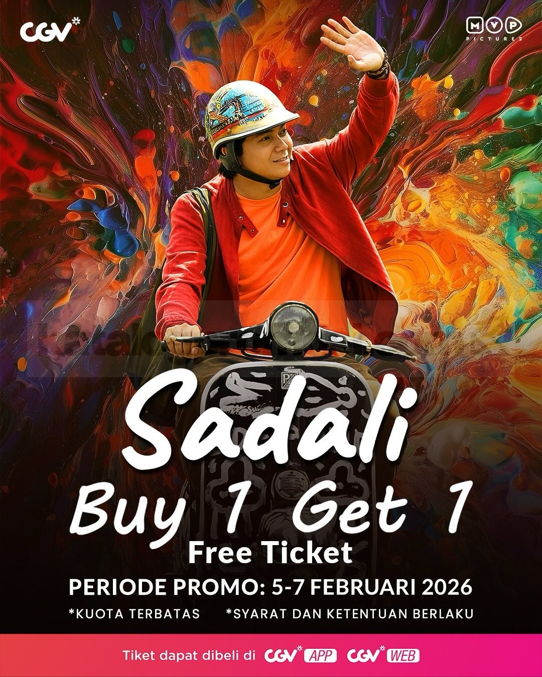 Promo CGV Beli 1 Gratis 1 Film Sadali beli 2 tiket bayar 1 via voucher aplikasi berlaku mulai tanggal 5 Februari 2026 – 7 Februari 2026 di seluruh outlet