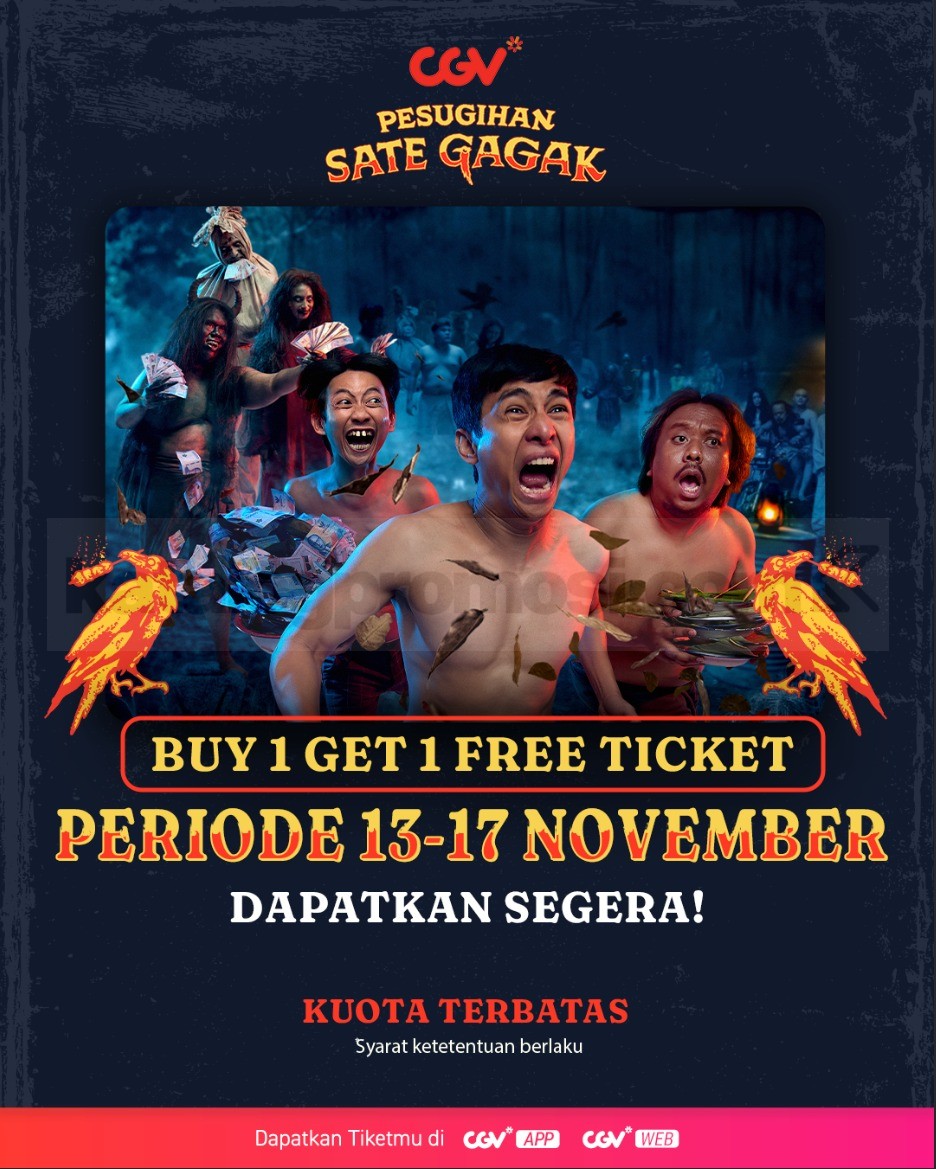 Biar takutnya & ketawanya nggak sendirian, sekarang saatnya nonton film horor terbaru Pesugihan Sate Gagak dengan promo CGV Beli 1 Gratis 1 tiket film Pesugihan Sate Gagak! ππ Promo ini bikin pengalaman menonton kamu lebih seru karena bisa ajak teman atau pasangan tanpa perlu bayar dua tiket.