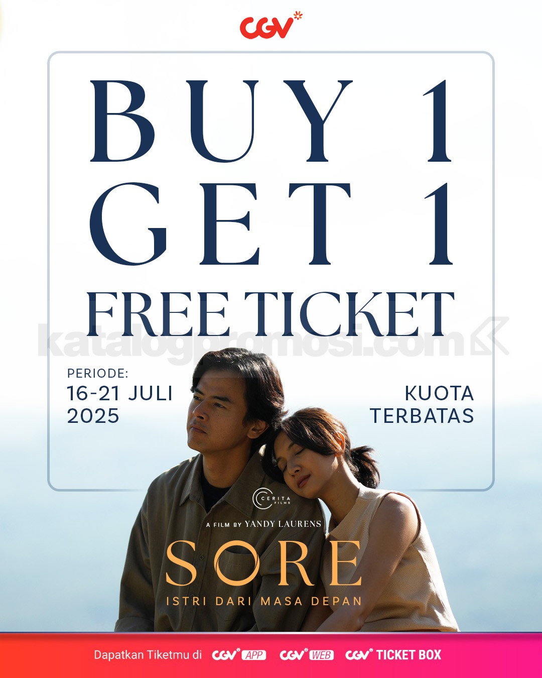 Program penjualan tiket lebih awal dari CGV dengan penawaran beli 1 gratis 1 tiket film tertentu.