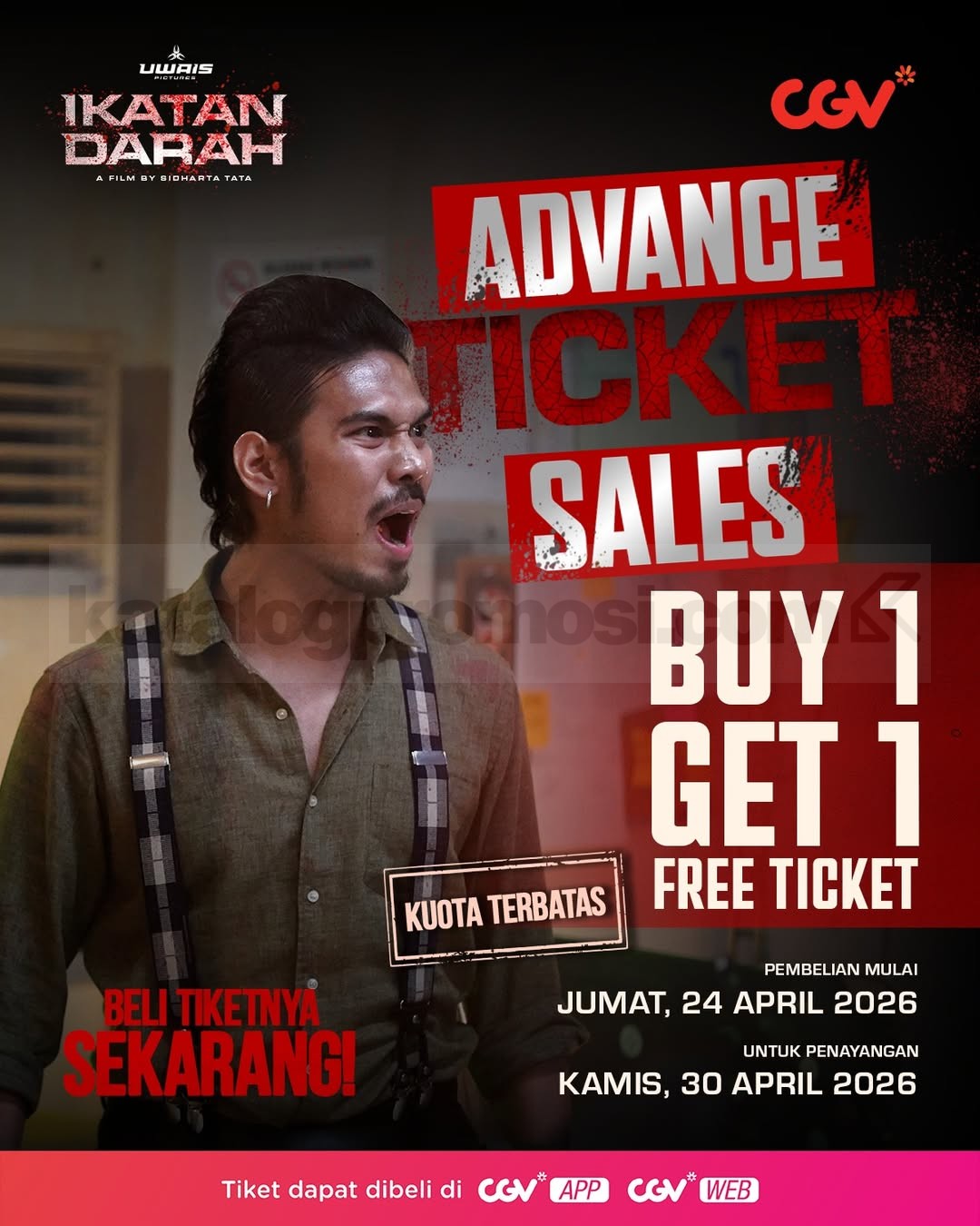 Promo ini berlaku untuk pembelian tiket pada tanggal 24 April 2026 dan digunakan untuk penayangan film Ikatan Darah pada 30 April 2026. Kamu bisa langsung pesan tiket melalui aplikasi atau website CGV dengan mudah.