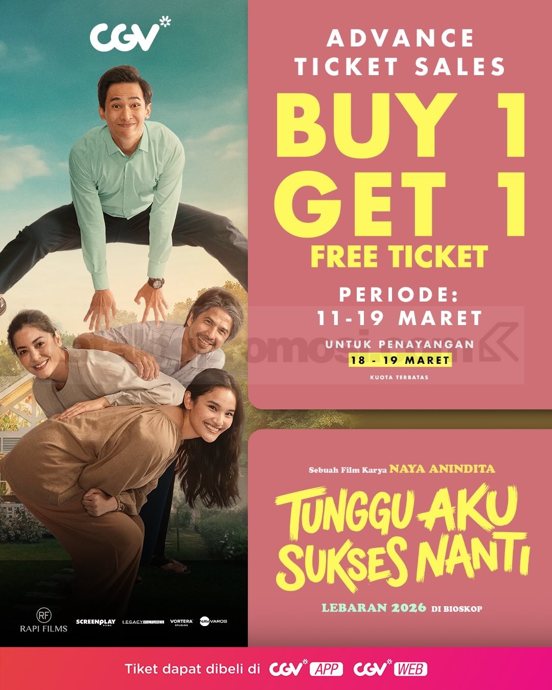 Promo CGV Beli 1 Gratis 1 Tiket Tunggu Aku Sukses Nanti melalui Advance Ticket Sales di aplikasi dan web CGV berlaku mulai tanggal 11 Maret 2026 – 19 Maret 2026.