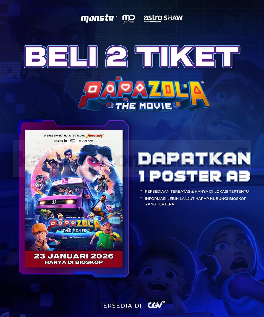 Cek jadwal filmnya sekarang dan manfaatkan Promo CGV Beli 2 Tiket Gratis Poster A3 Papa Zola The Movie sebelum stok posternya habis.