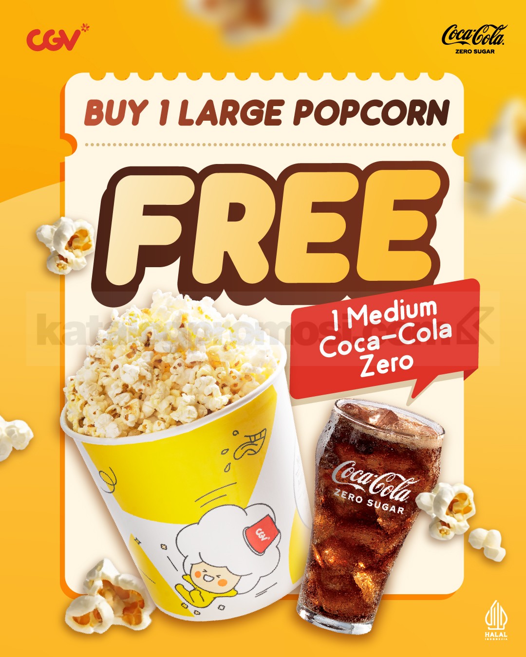 Promo CGV beli Popcorn Large dapat gratis 1 Medium Coke Zero berlaku mulai 7 sampai 13 Juli 2025 di semua lokasi CGV secara offline.