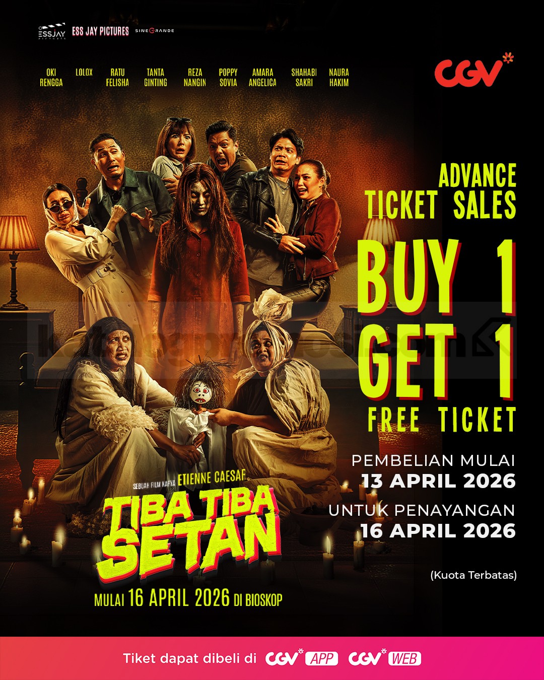 Melalui Promo CGV Buy 1 Get 1 Film Tiba Tiba Setan ini, kamu cukup beli 1 tiket dan langsung dapat 1 tiket gratis untuk penayangan khusus di tanggal 16 April 2026. Pembelian tiketnya sendiri sudah bisa dilakukan mulai 13 April 2026 lewat aplikasi atau website CGV.