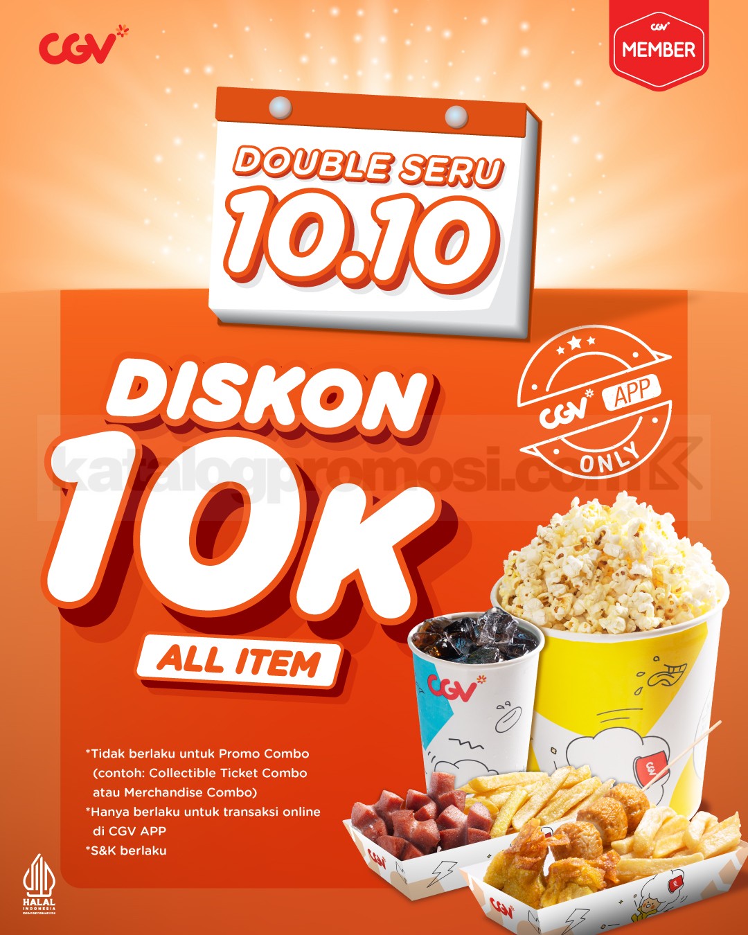 Promo CGV Double Seru 10.10 Diskon Rp10Ribu untuk Semua Item, Berlaku mulai 9-11 Oktober 2025.