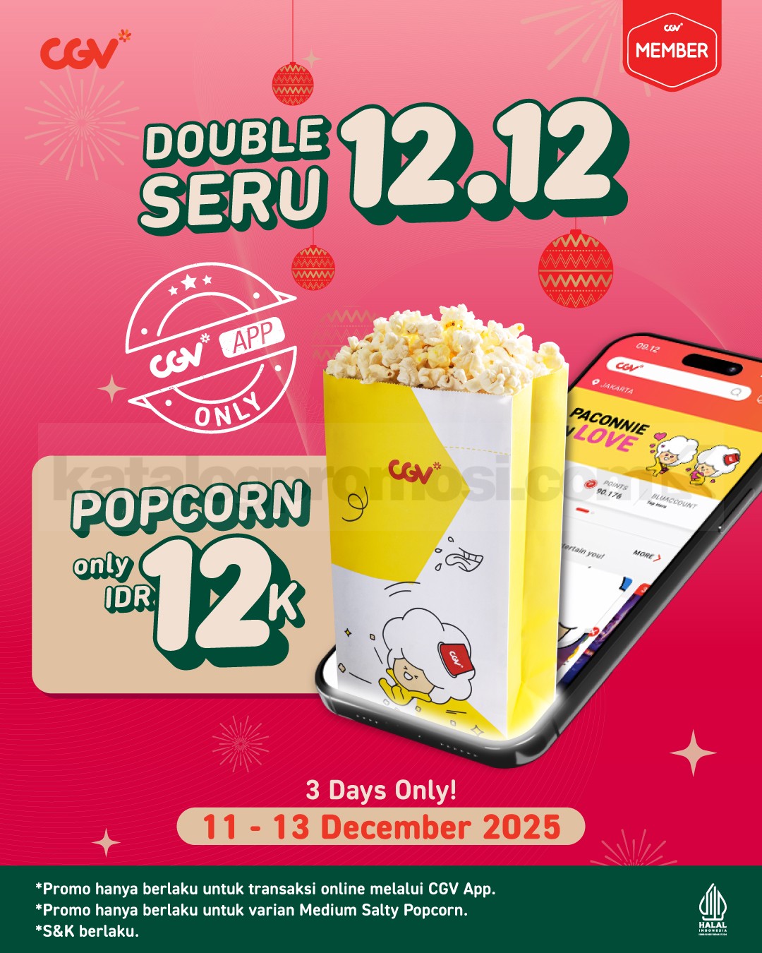 Promo CGV Double Seru 12.12 Medium Popcorn Rp. 12.000, beli hemat via aplikasi + tukar di seluruh outlet, berlaku mulai 11-13 Desember 2025.