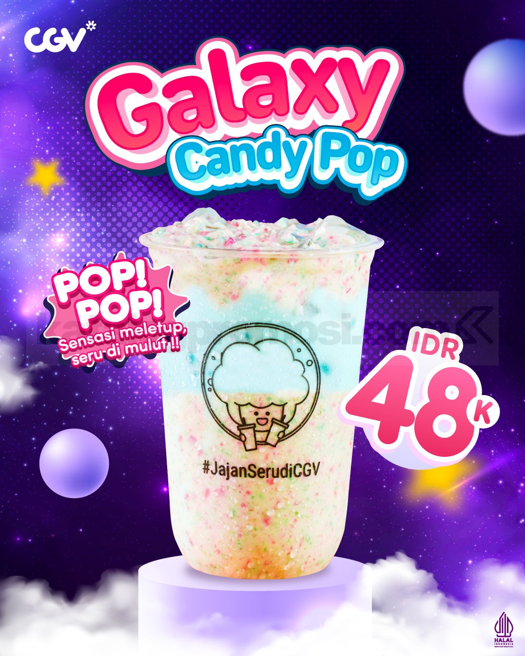 Promo CGV Galaxy Candy Pop Harga Rp. 48.000 tersedia di seluruh CGV untuk minuman manis segar dengan sensasi pop pop di mulut selama persediaan masih ada.
