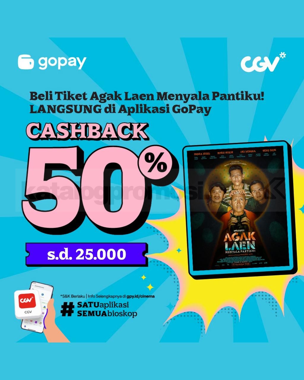 Promo CGV GoPay Cashback 50% Tiket Agak Laen Menyala Pantiku dengan potongan saldo GoPay untuk pembelian tiket, berlaku selama persediaan masih ada di seluruh outlet.
