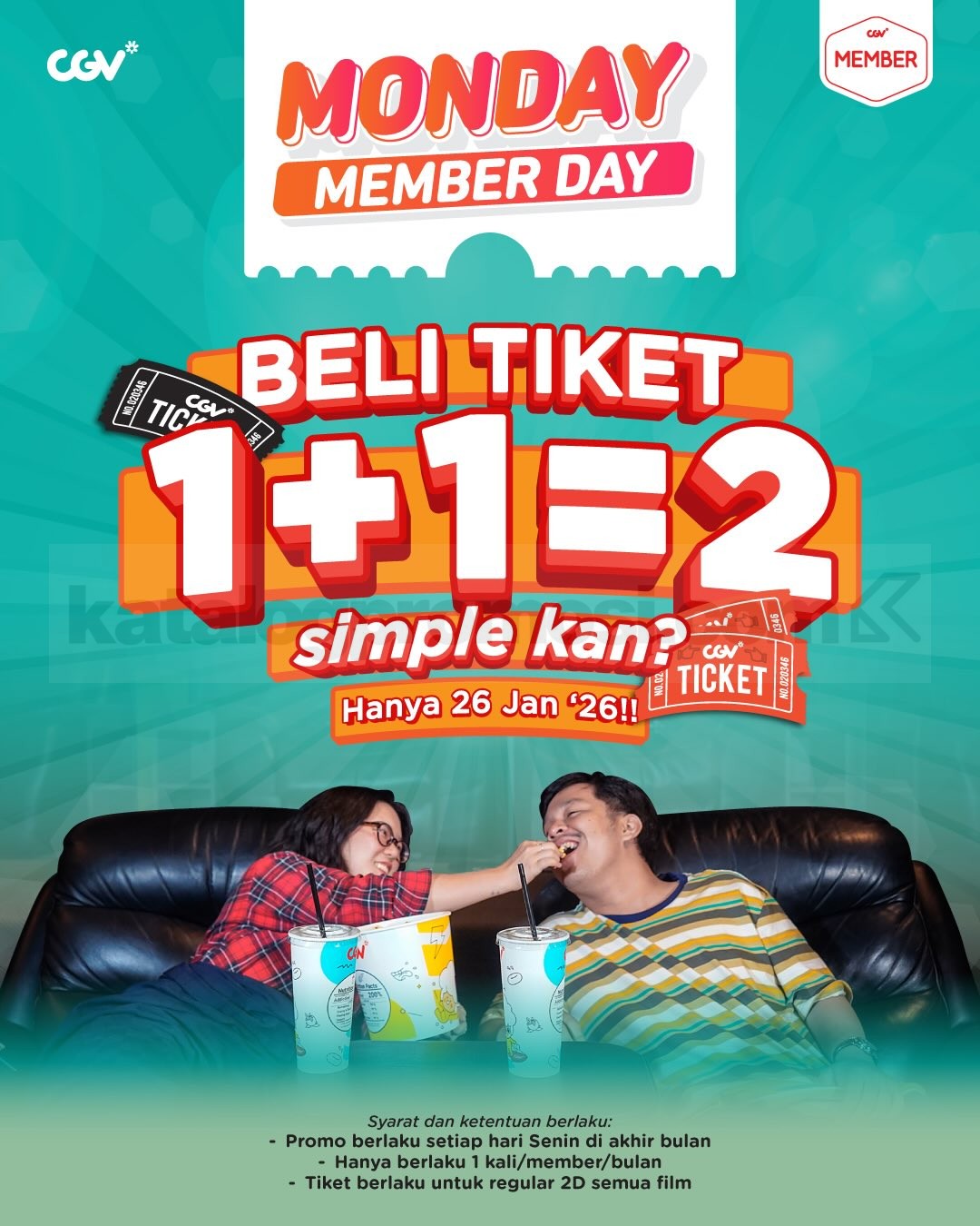 Promo CGV Monday Member Day Beli 1 Gratis 1 Tiket berlaku hanya di tanggal 26 Januari 2026 untuk transaksi online melalui aplikasi dan website CGV.