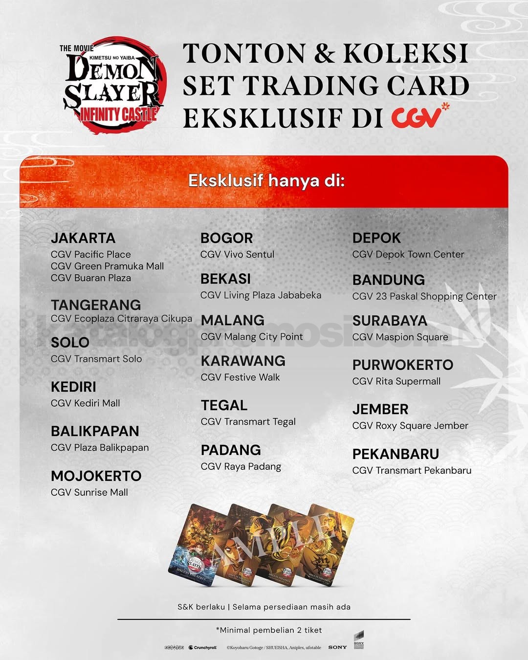 👉 Cek gambar promo CGV Nonton Demon Slayer Infinity Castle Gratis Trading Card di bawah ini buat lihat mekanisme penukaran, lokasi, dan penampakan kartu eksklusifnya!