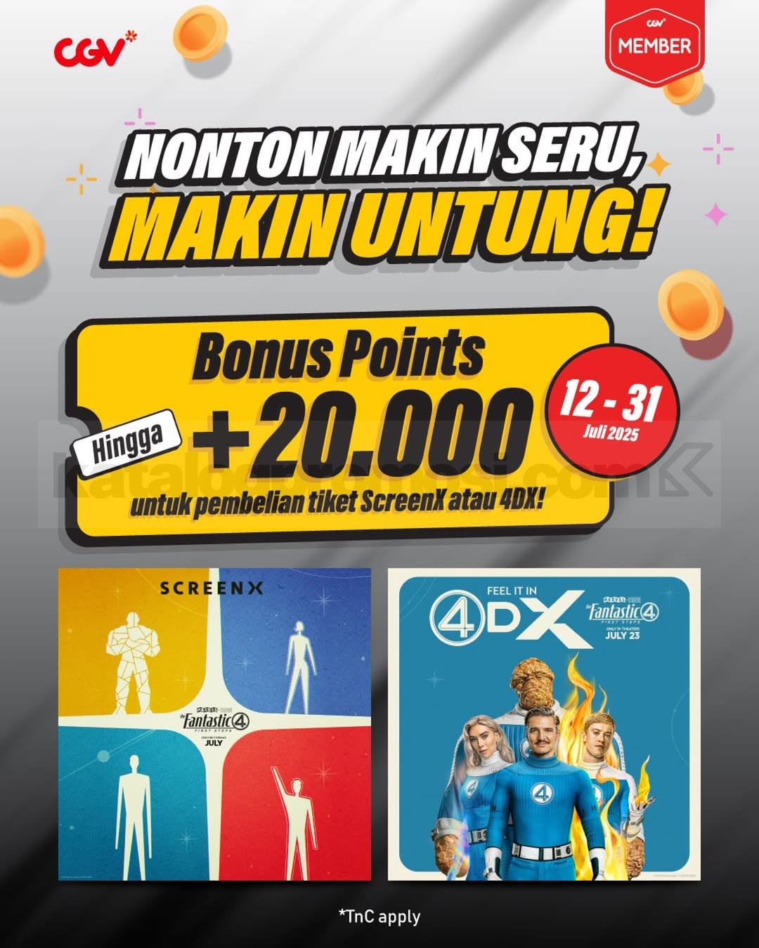 Selama periode 12–31 Juli 2025, kamu bisa dapetin ekstra poin setiap kali beli tiket nonton. Kalau kamu nonton 4DX, kamu bakal dapet +20.000 CGV Points, dan kalau nonton ScreenX, kamu dapet +10.000 CGV Points. Lumayan banget kan buat ditukerin sama tiket film lain atau makanan? 🎟️🍿