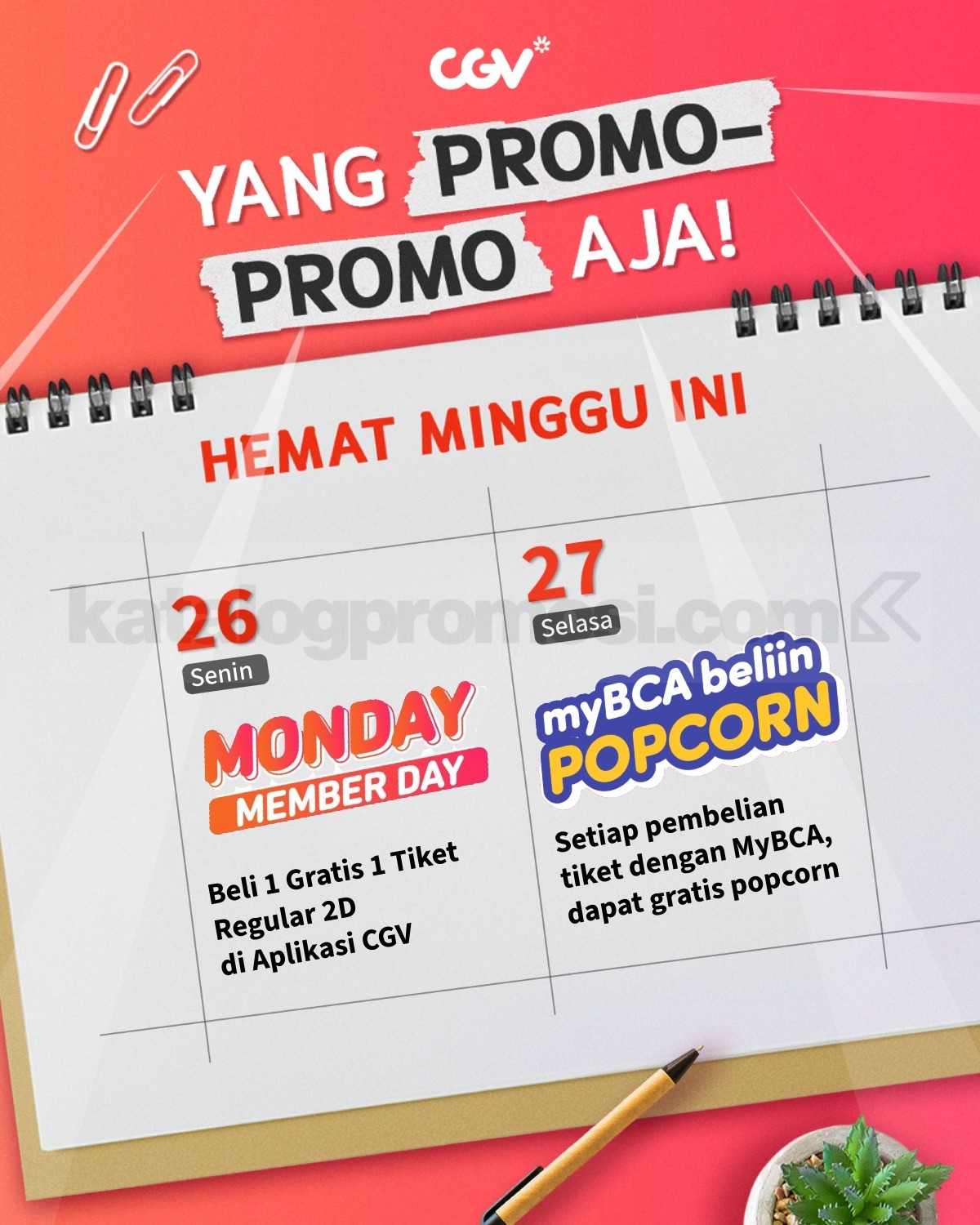 Masuk 26 Januari 2026, Monday Member Day aktif dengan promo Beli 1 Gratis 1 Tiket Regular 2D lewat aplikasi CGV.