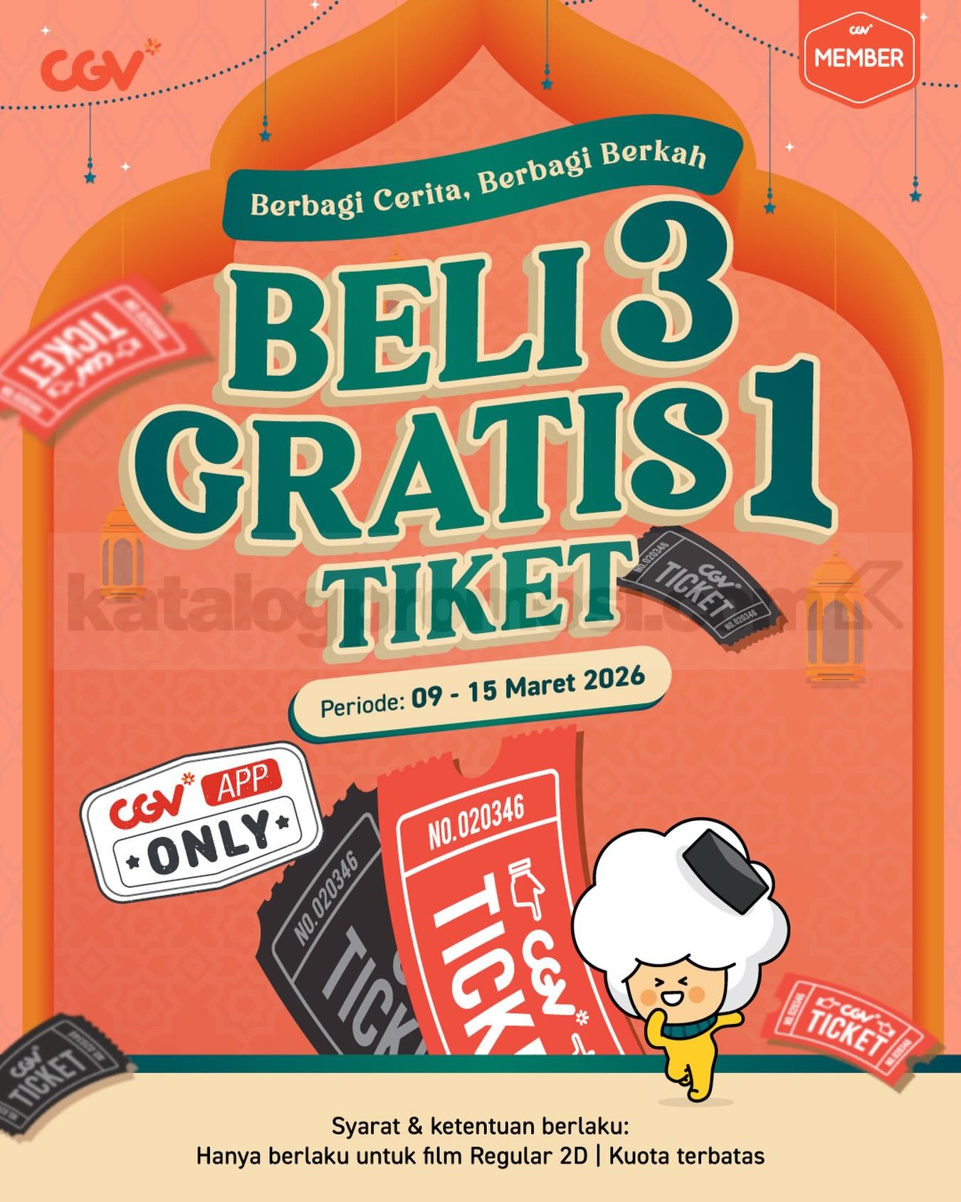 Promo CGV Ramadan Beli 3 Gratis 1 Tiket Regular 2D periode 09 – 15 Maret 2026 untuk pembelian tiket film melalui CGV APP khusus member CGV.