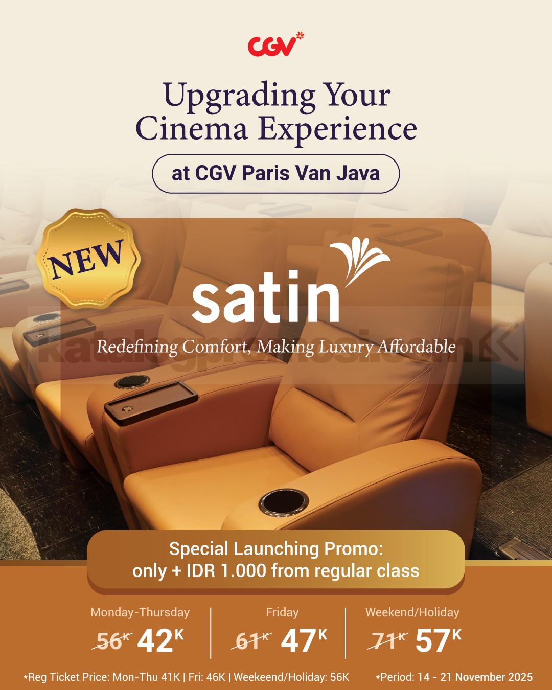 Promo CGV Satin Auditorium Launching Tiket mulai Rp.42.000, nambah Rp1.000 dari tiket reguler + pesan di web/app CGV berlaku 14–21 November 2025.