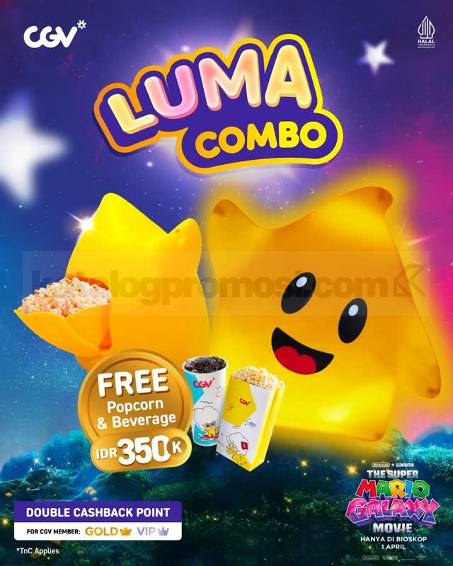 Promo CGV The Super Mario Galaxy LUMA Combo Rp. 350.000 paket popcorn container + minuman berlaku mulai tanggal 18 Maret 2026 di lokasi tertentu.