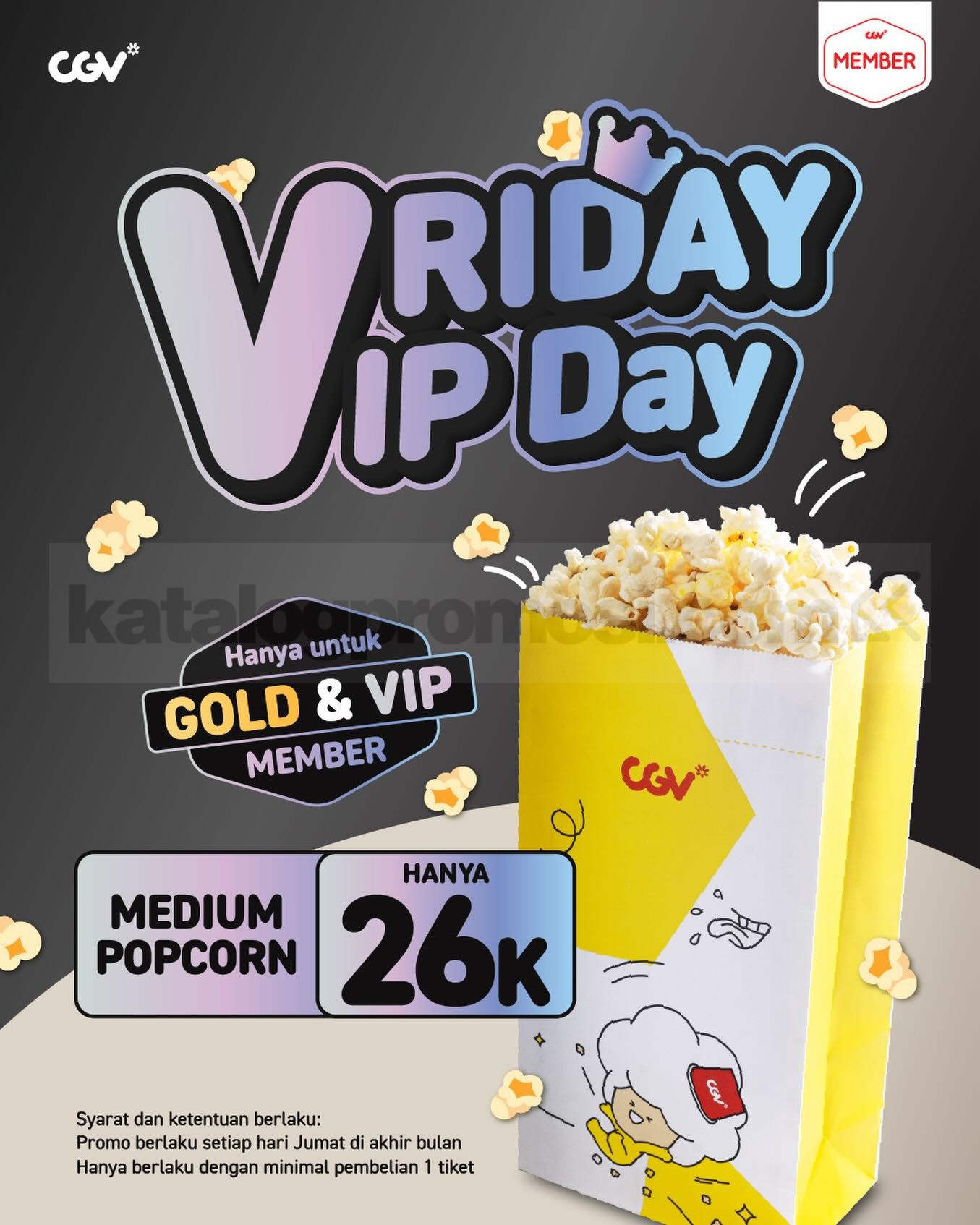 Promo CGV VRIDAY VIP DAY Medium Popcorn Rp. 26.000 untuk Member Gold & VIP dengan pembelian tiket online, berlaku mulai tanggal 30 Januari 2026 di seluruh CGV.