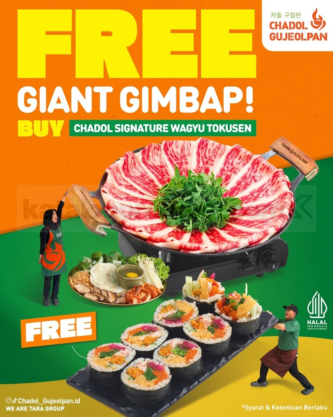 Promo Chadol Gujeolpan Buy 1 Get 1 Free tetap jalan walaupun kondisi lagi chaos plus tanggal tua kayak gini 😉❤️. Lewat promo ini, pengunjung bisa menikmati Chadol Signature Wagyu Tokusen dan langsung mendapatkan Giant Gimbap tanpa biaya tambahan dalam satu kali transaksi makan di tempat.