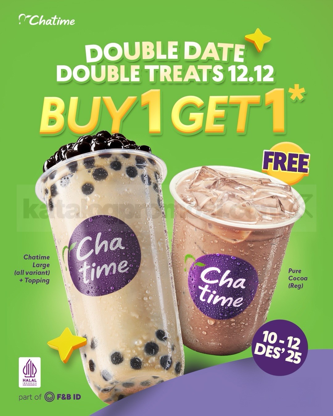 - Promo berlaku di outlet Chatime yang ikut program Double Date Double Treats 12.12.