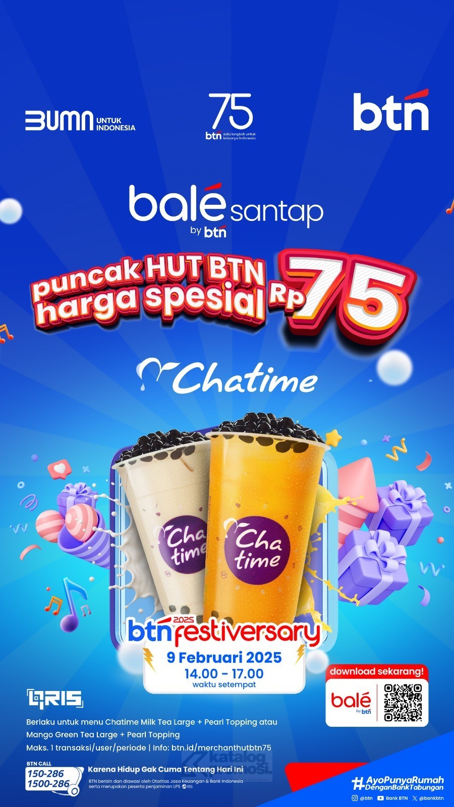 Promo Chatime BTN HUT ke-75 Minuman Large Hanya Rp 75,-! khusus transaksi dengan transaksi QRIS balé by BTN. Berlaku 9 Februari 2025 pukul 14.00-17.00 di semua outlet.