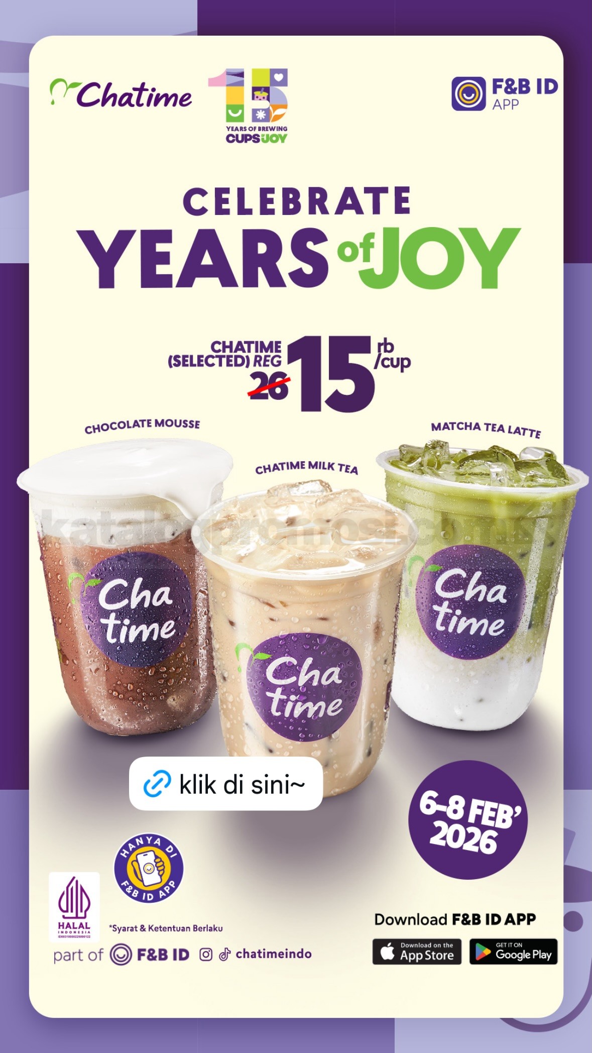 Promo Chatime Celebrate Years of Joy Regular Drink Rp. 15.000 berlaku mulai tanggal 6 – 8 Februari 2026 khusus pemesanan lewat F&B ID App di outlet tertentu