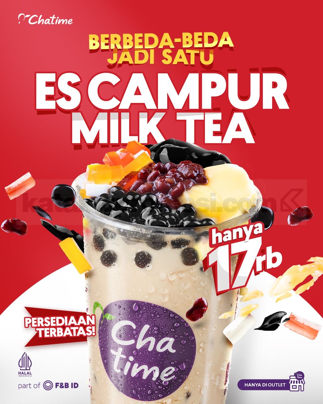 Promo ini berlaku di seluruh gerai Chatime se-Indonesia (kecuali Chatime Dufan, Bandara, Atlas, dan Gambir). Dengan harga cuma Rp17.000, kamu udah bisa nikmatin “es campur versi upgrade” ala Chatime yang pastinya segar, creamy, dan bikin susah move on. 💜