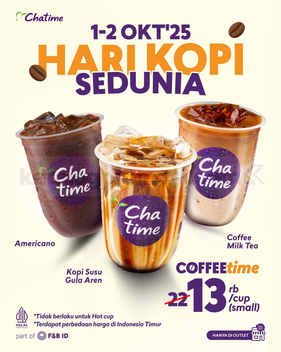 “You save everyone, but who save you? Chatime Coffee Series dong~” 🫶 Hari Kopi Internasional jadi momen pas buat ngopi seru bareng Chatime. Spesial tanggal 1–2 Oktober 2025, Chatime kasih promo menu Coffee Series cuma Rp13.000 per cup (size small).