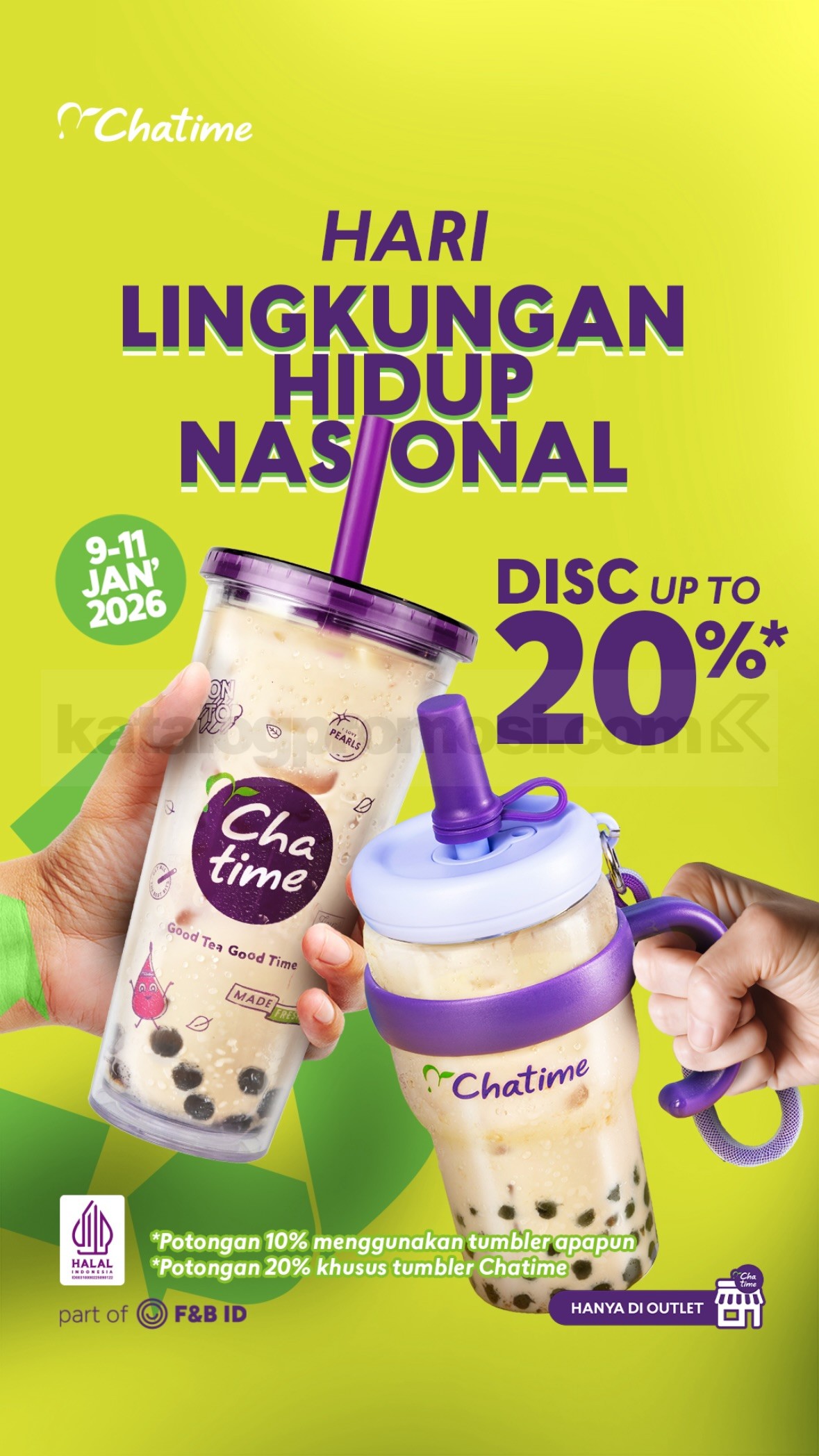 Promo CHATIME Hari Lingkungan Hidup Nasional diskon hingga 20% berlaku 9 β 11 Januari 2026, beli minuman Chatime pakai tumbler langsung potong harga di outlet.