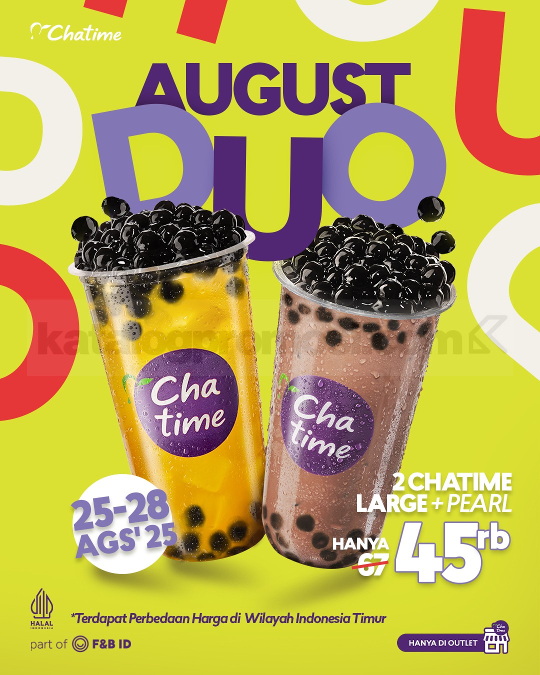Promo Chatime Joy Bundling 2 Large Cup + Pearl cuma Rp45.000 pilih minuman favorit lengkap topping pearl, berlaku 25–28 Agustus 2025 di outlet Chatime pilihan.