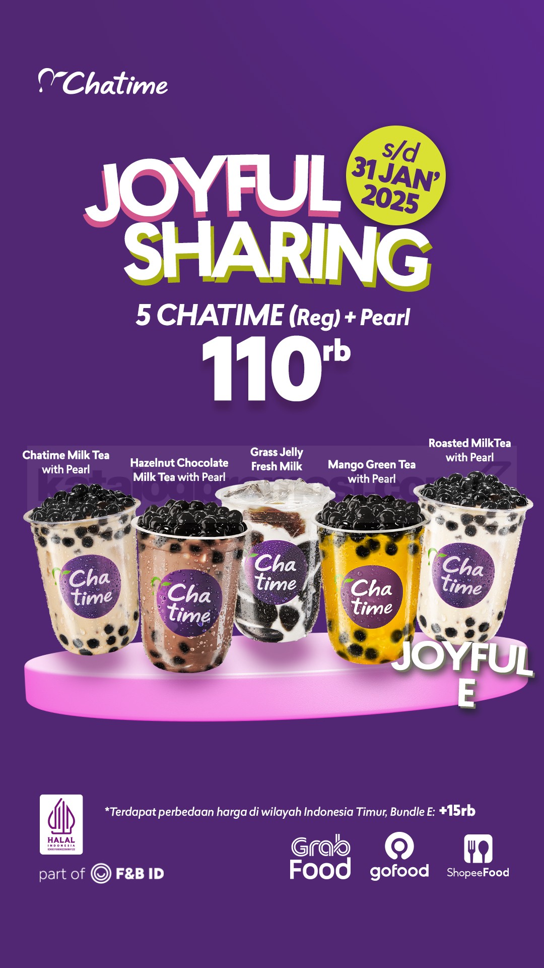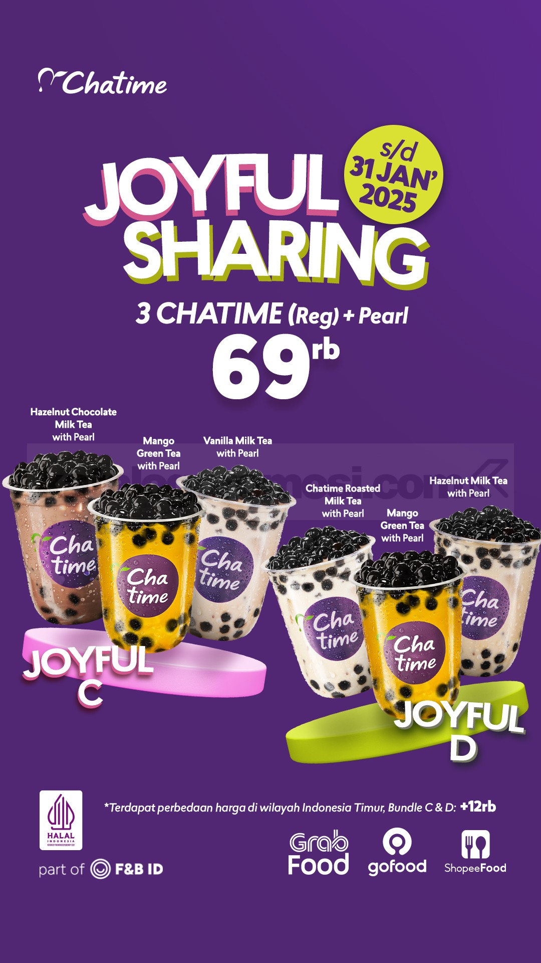 Promo CHATIME Joyful Sharing paket minuman mulai Rp. 50.000 berlaku sampai 31 Januari 2025, pilihan bundle Chatime Regular + Pearl via GrabFood, GoFood, dan ShopeeFood.