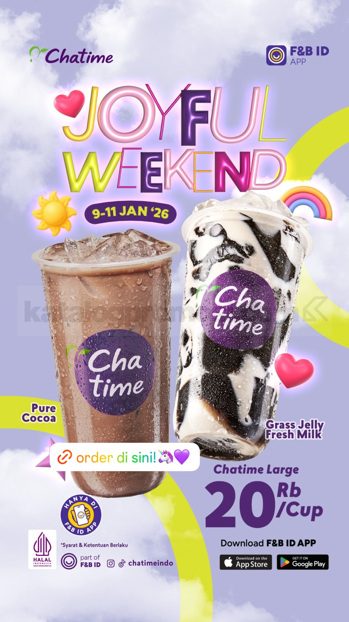 Jajan Chatime di akhir pekan jadi lebih santai lewat Promo CHATIME Joyful Weekend. Di periode ini, minuman Chatime ukuran Large bisa kamu nikmati dengan harga Rp. 20.000 per cup, khusus pemesanan lewat F&B ID App. Tinggal buka aplikasi, pilih menu yang termasuk promo, lalu pesan seperti biasa.