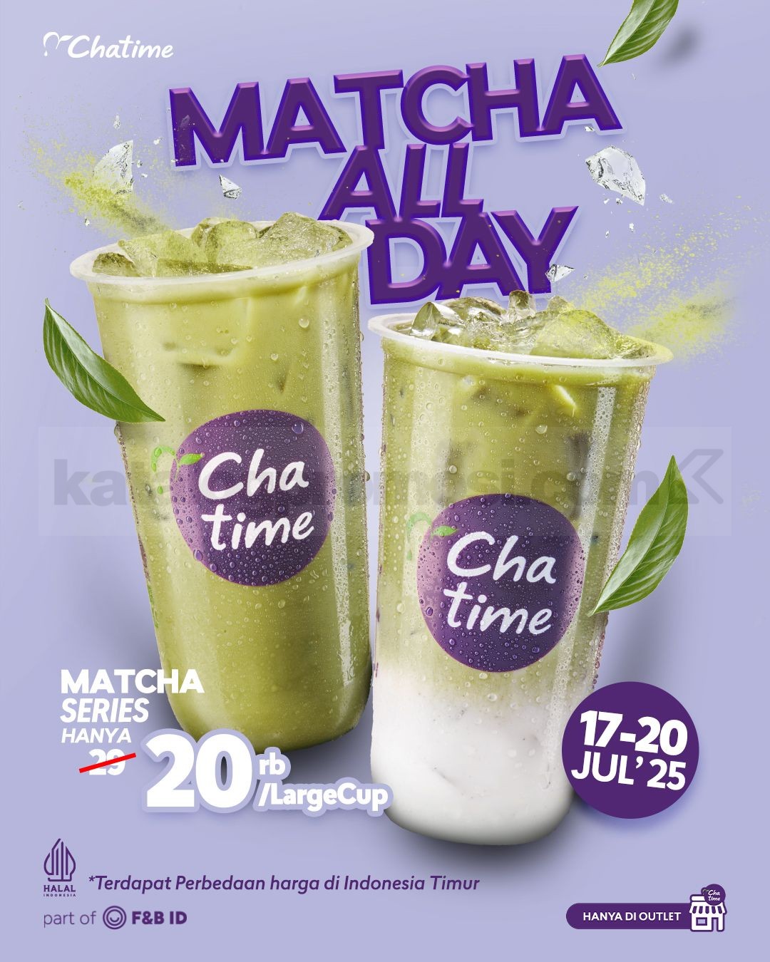 Promo Chatime Matcha Series cuma Rp20.000! Berlaku 17–20 Juli 2025 untuk Matcha Milk Tea & Matcha Tea Latte di seluruh outlet Chatime Indonesia.
