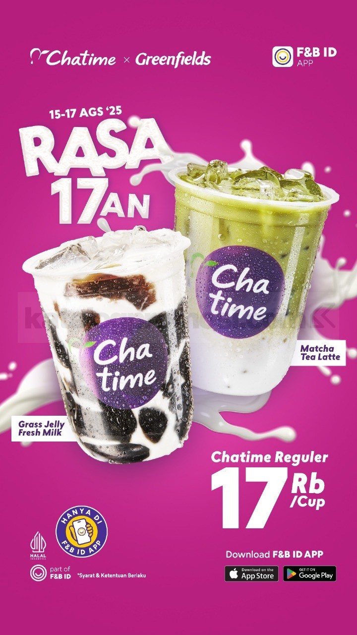 Promo Chatime Merdeka Rasa 17-an harga spesial Rp17.000 untuk varian Grass Jelly Fresh Milk dan Matcha Tea Latte ukuran regular, berlaku 15–17 Agustus 2025.