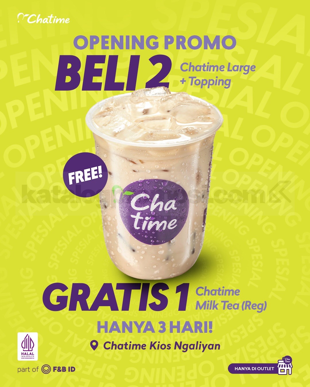 Jangan sampai ketinggalan, datang langsung ke Chatime Ngaliyan dan nikmati promo beli 2 gratis 1 selama periode opening. Rasakan sensasi Chatime Large favoritmu sekarang juga! 🧋💜