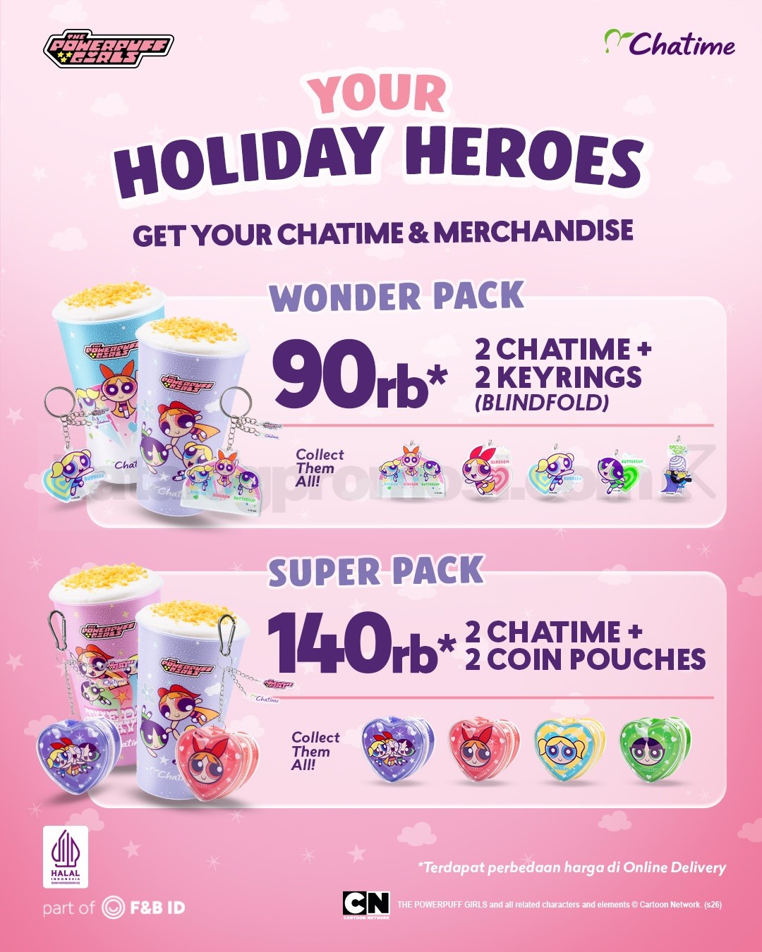 Promo Chatime Powerpuff Girls Wonder Pack & Super Pack dengan paket minuman plus merchandise, harga mulai Rp. 90.000, tersedia di outlet Chatime dan online delivery dengan penyesuaian harga