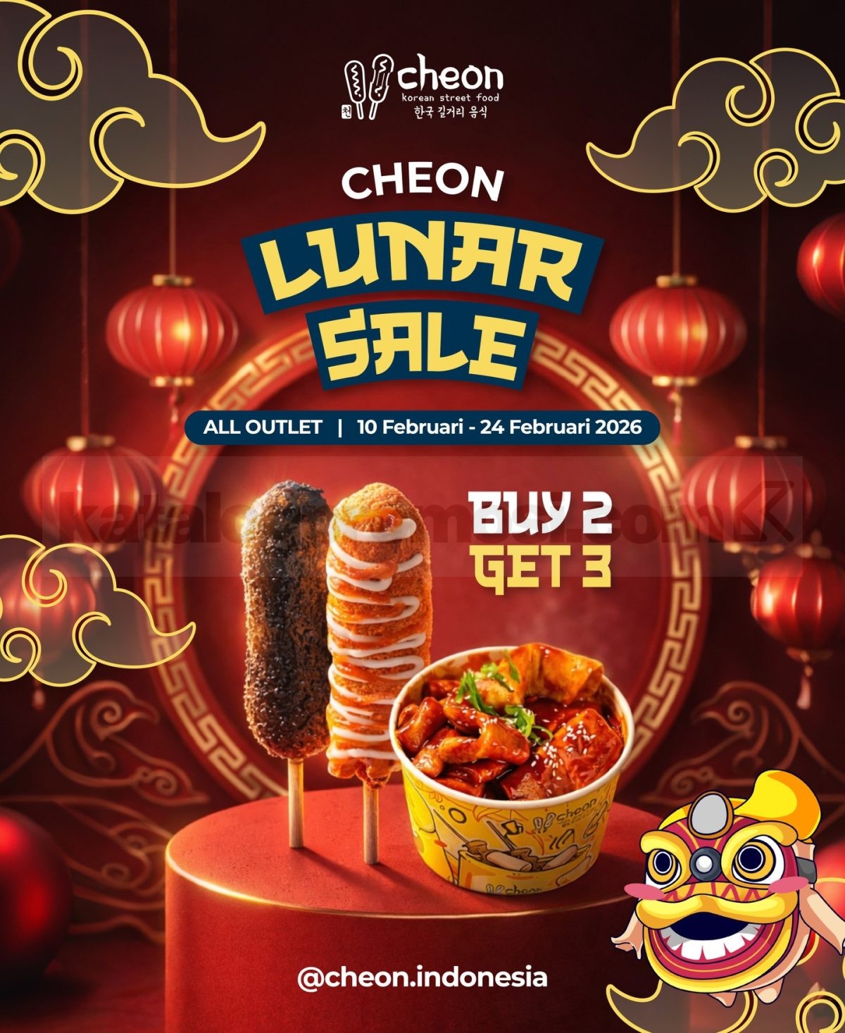 Promo Cheon Lunar Sale BUY 2 GET 3 dengan bonus GRATIS Sausage Corndog berlaku 10 – 24 Februari 2026 di seluruh outlet Cheon Indonesia.