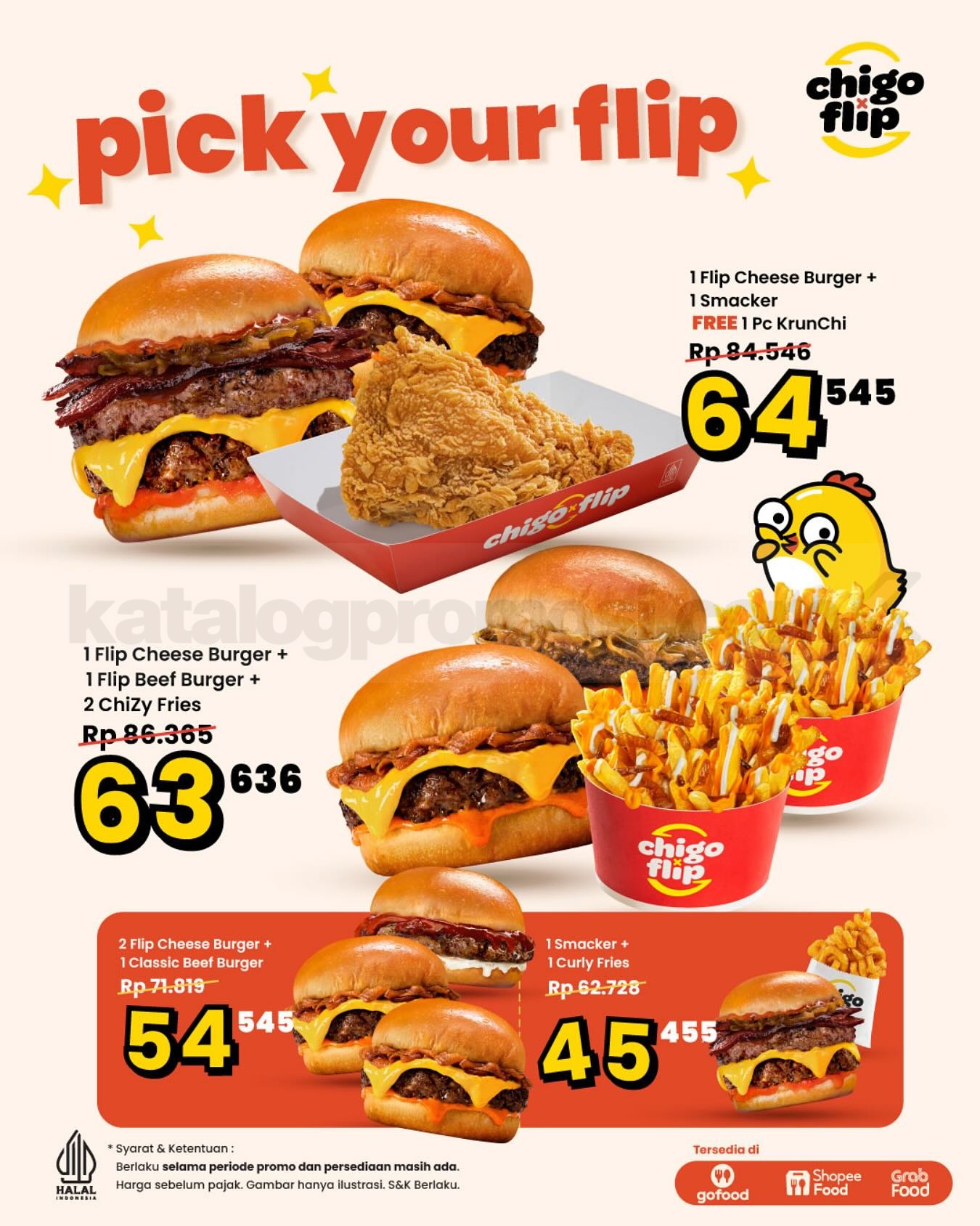 Promo Chigo x Flip Pick Your Flip mulai Rp45.000 aja! Paket burger & fries hemat buat sharing bareng bestie atau family, cuma tersedia via GoFood, dan ShopeeFood. Buruan pesen sebelum kehabisan!