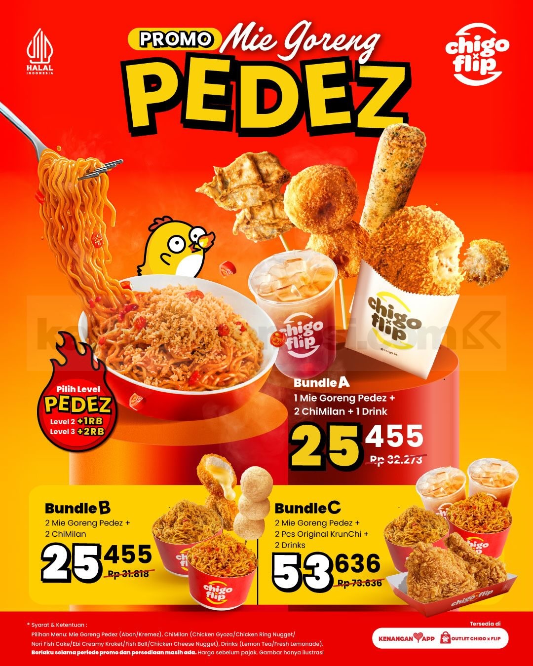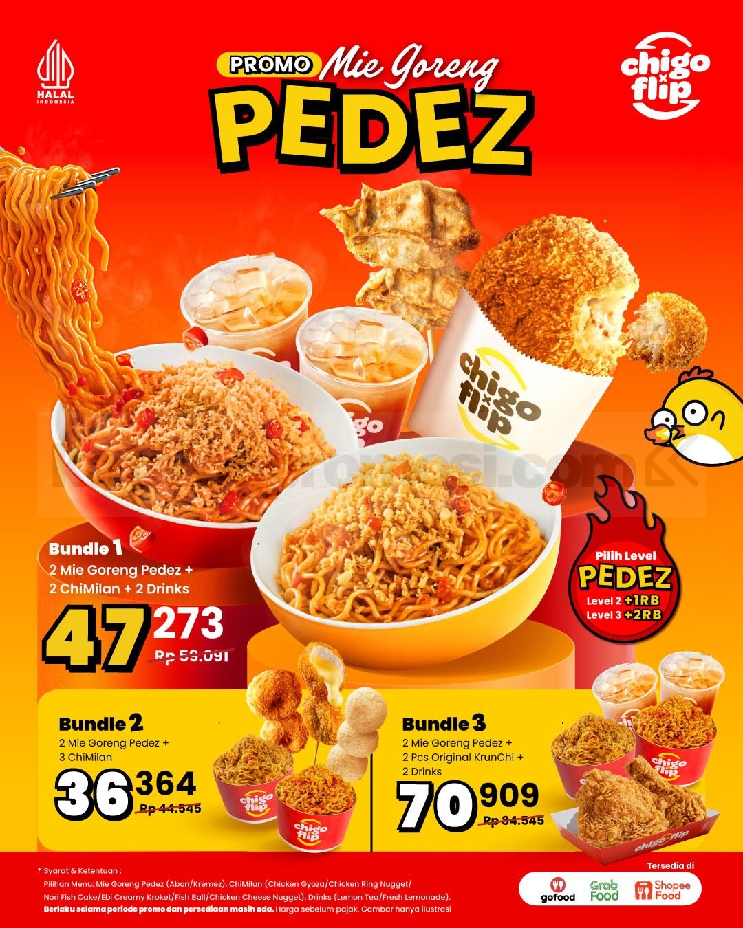 Promo CHIGO x FLIP Bundle Mie Goreng Pedez mulai Rp. 25.455 dengan pilihan level pedas 0–3 dan paket ChiMilan berlaku selama periode promo berlangsung di seluruh outlet.