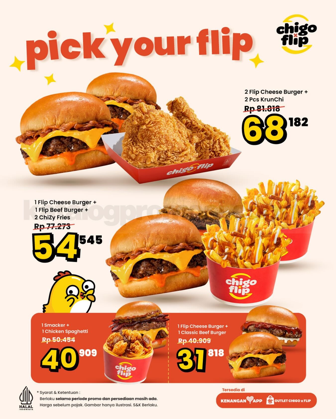 Promo Chigo x Flip Pick Your Flip mulai Rp45.000 aja! Paket burger & fries hemat buat sharing bareng bestie atau family, cuma tersedia via GoFood, dan ShopeeFood. Buruan pesen sebelum kehabisan!