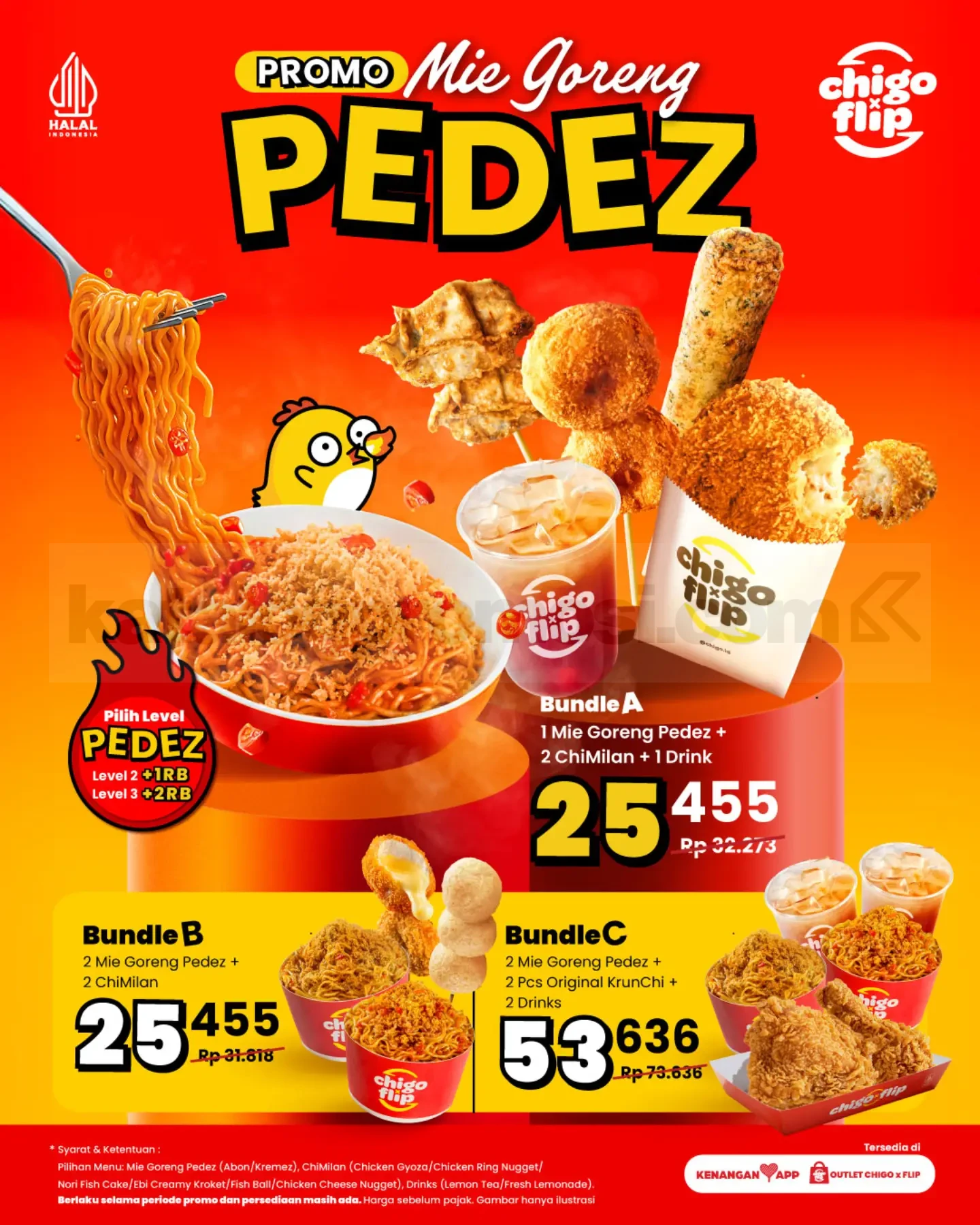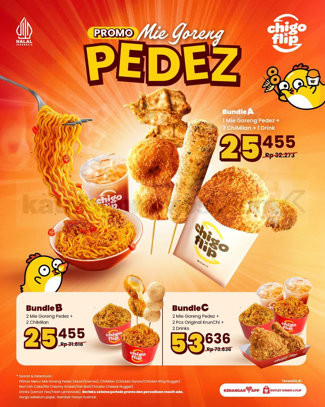Promo Chigo x Flip Mie Goreng PEDEZ Bundle Hemat mulai Rp. 25.455 dengan pilihan paket mie, ChiMilan, dan minuman via Kenangan App, berlaku selama periode promo.