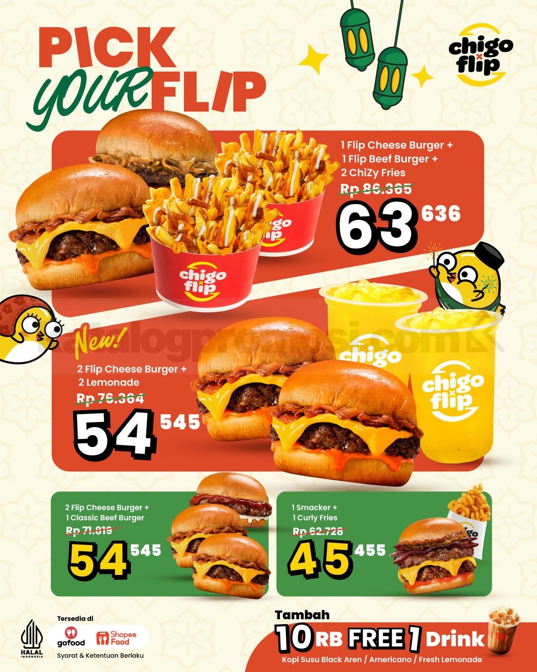 Promo Chigo x Flip Pick Your Flip mulai Rp. 25.455 paket burger, fries, dan minuman berlaku selama periode promo di seluruh outlet dan aplikasi