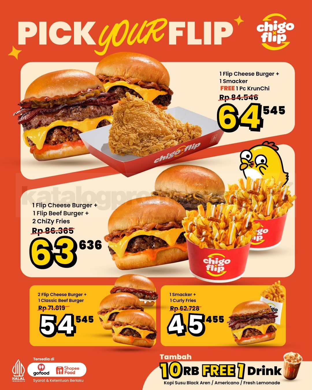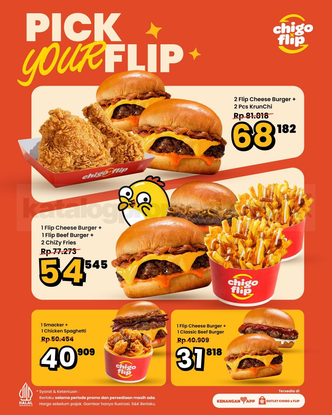 Promo Chigo x Flip Pick Your Flip Paket Hemat mulai Rp. 31.818 dengan beragam pilihan menu burger dan snack untuk jajan bareng, berlaku selama periode promo di outlet tertentu.