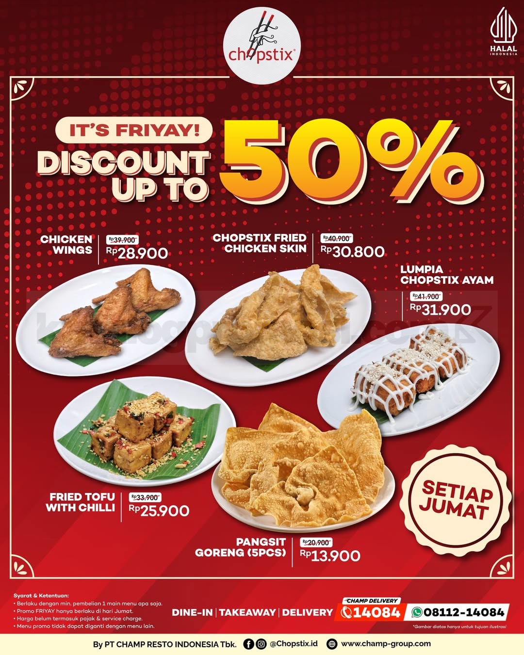 Setiap Jumat, kamu bisa nikmatin potongan harga hingga 50% lewat Promo Chopstix Friyay Treat Diskon Hingga 50% yang bikin waktu makan makin lengkap tanpa keluar biaya ekstra. Promo ini jadi pilihan pas buat kamu yang suka nambah camilan saat makan utama di Chopstix 🍗