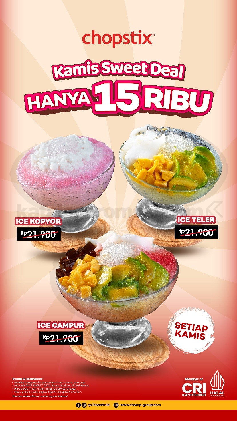 Promo Chopstix Kamis Sweet Deal dessert favorit Rp. 15.000 per porsi + nikmati Ice Kopyor, Ice Teler, Ice Campur, berlaku setiap Kamis di outlet tertentu